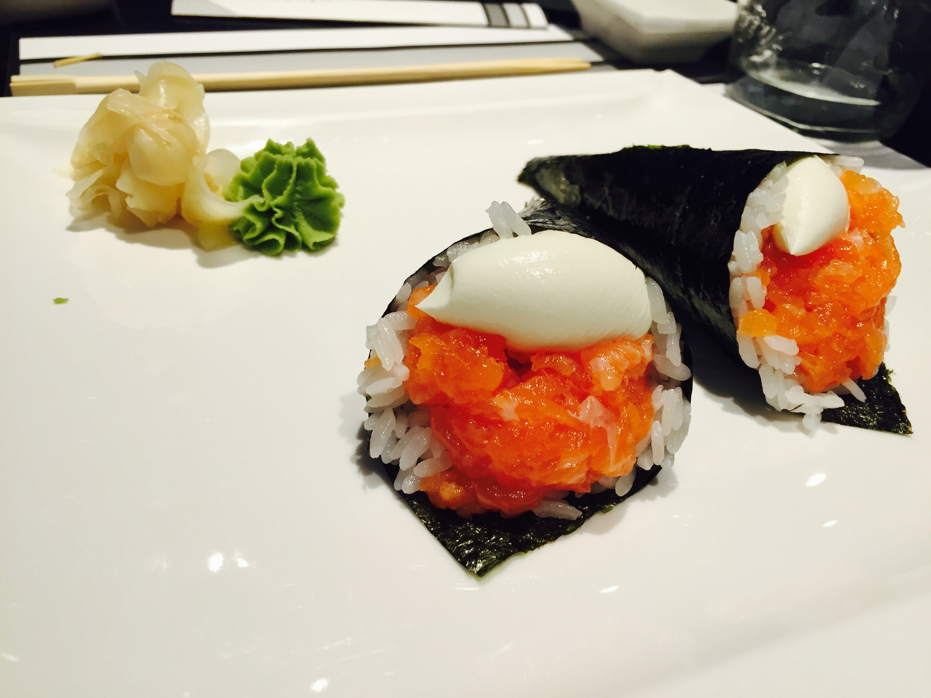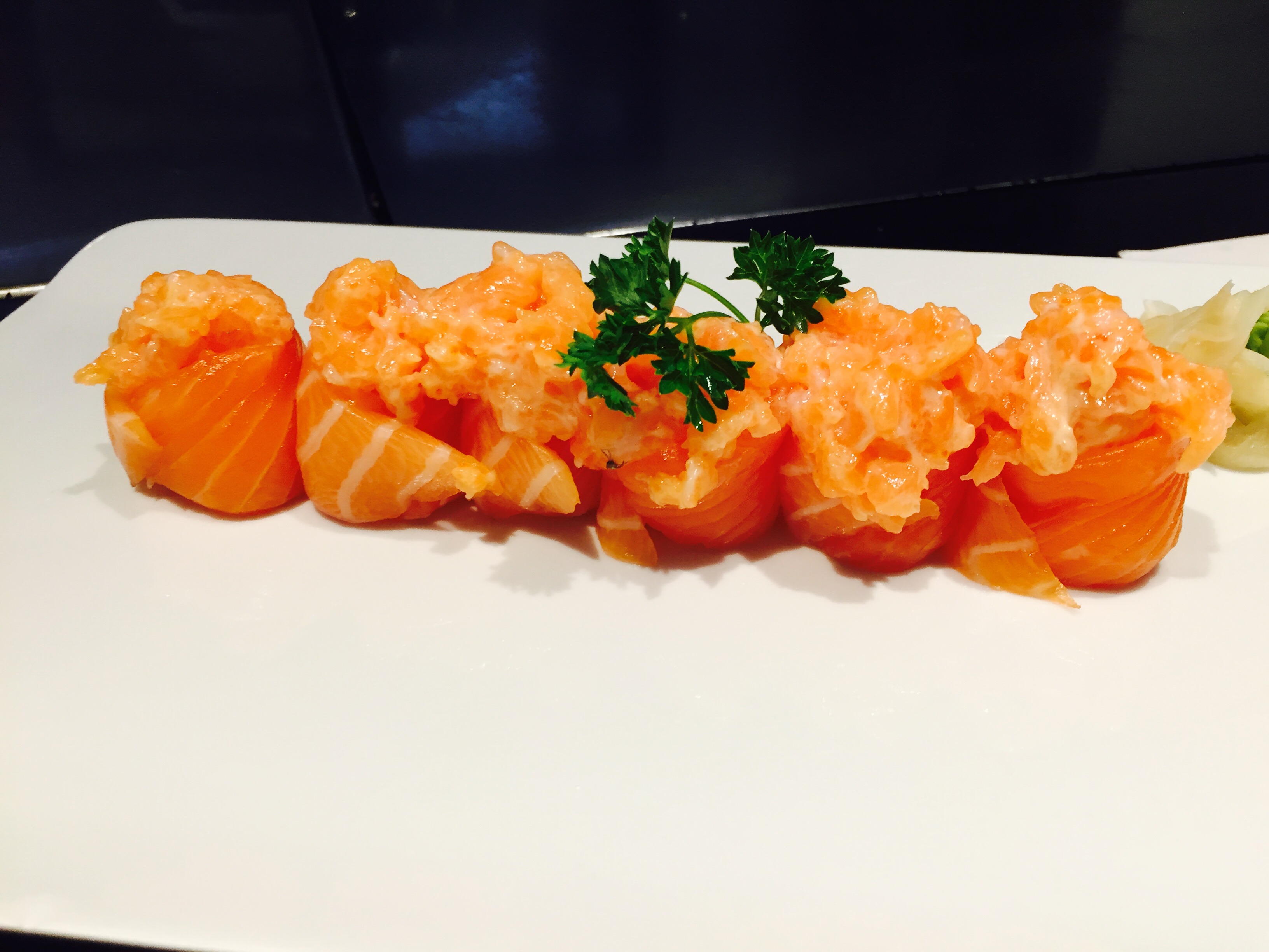 Sushi Special: Salmone, tartare di salmone piccante, scaglie di mandorle