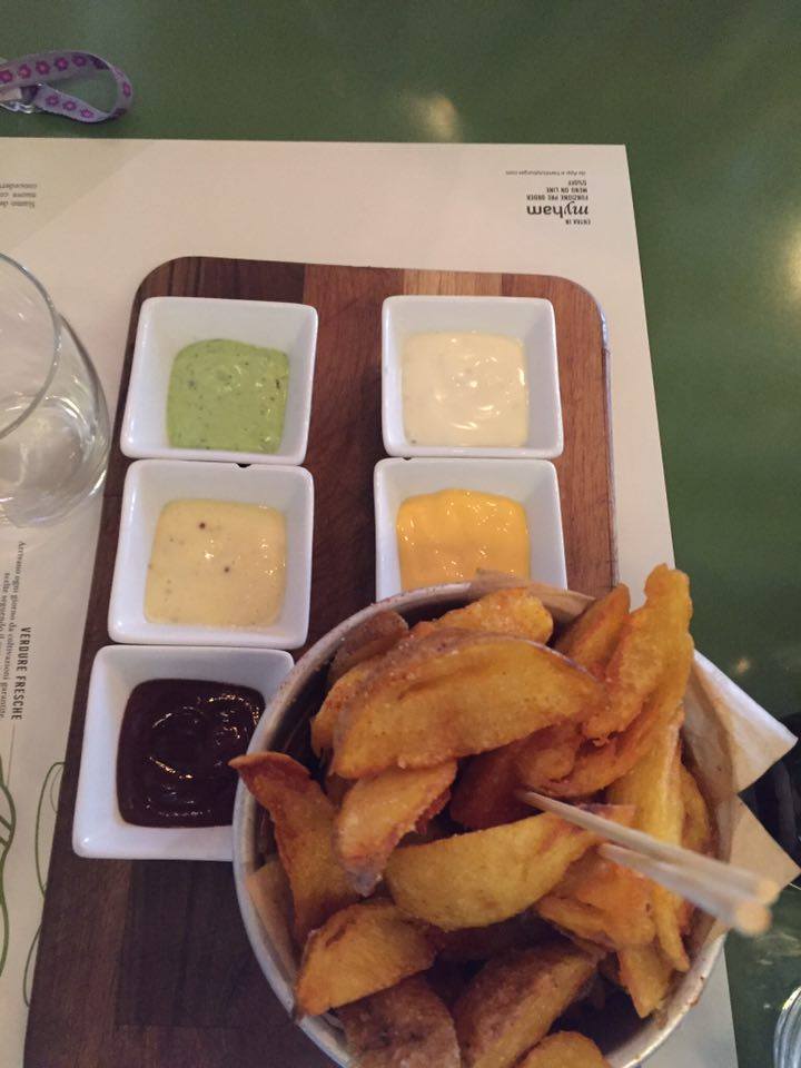 Patate tagliate a spicchi accompagnate da diverse salse…