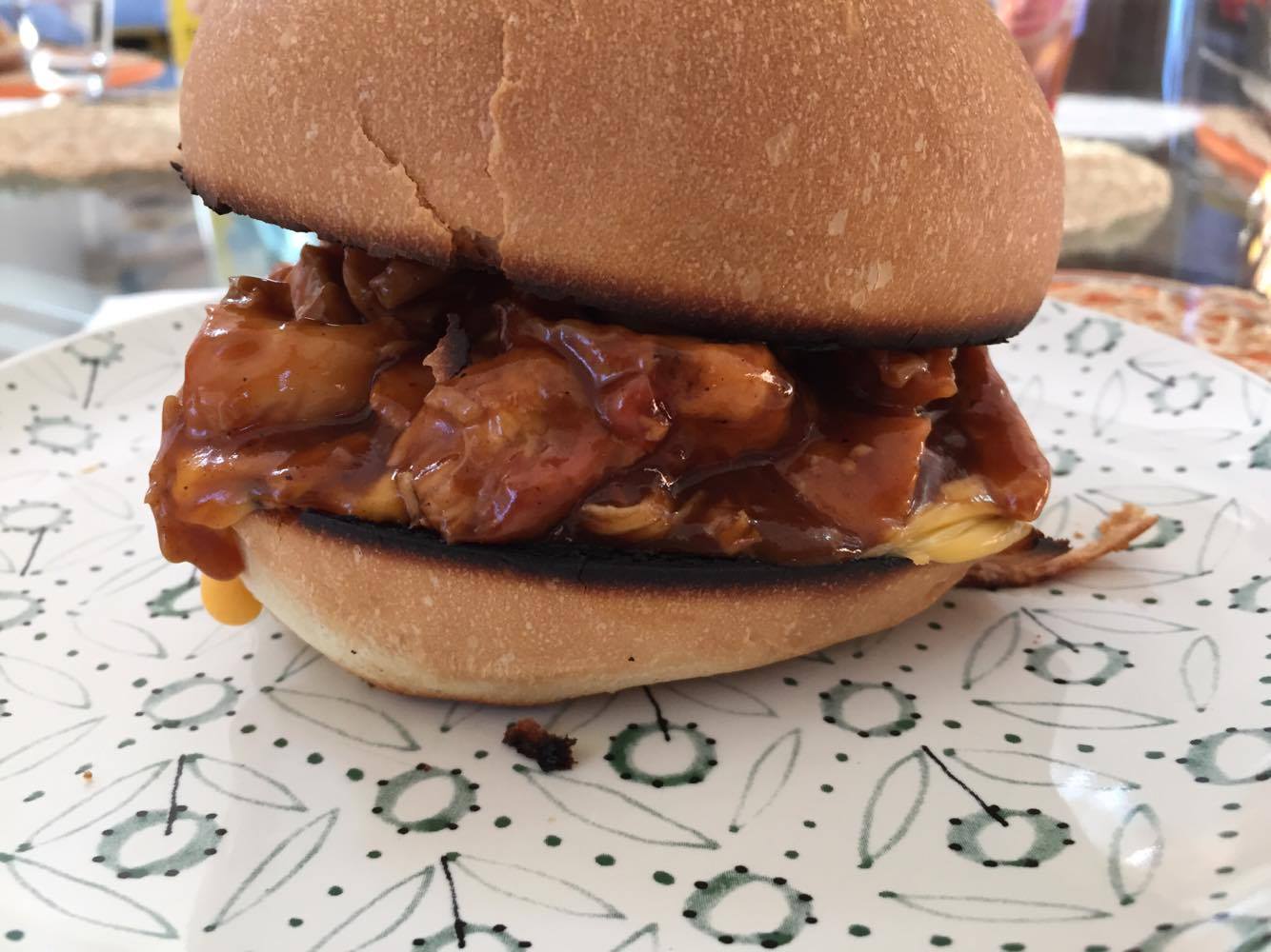 Panino con pollo saltato in padella nella barbecue e formaggio cheddar