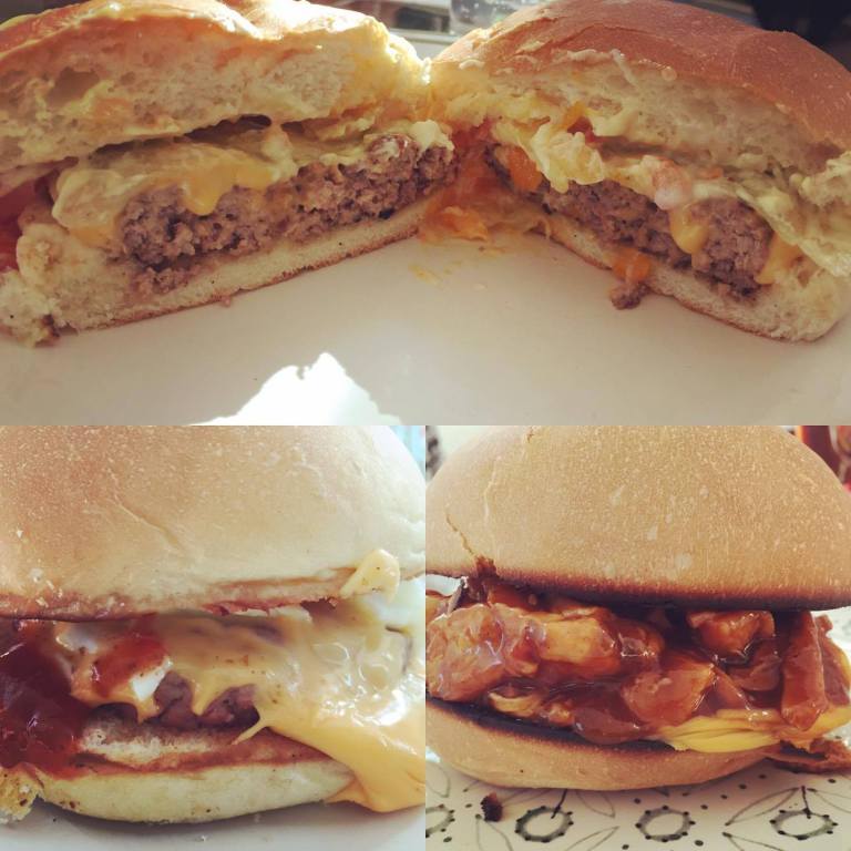 Burger con uovo, hamburger, formaggio cheddar, barbecue, salsa messicana e patatine