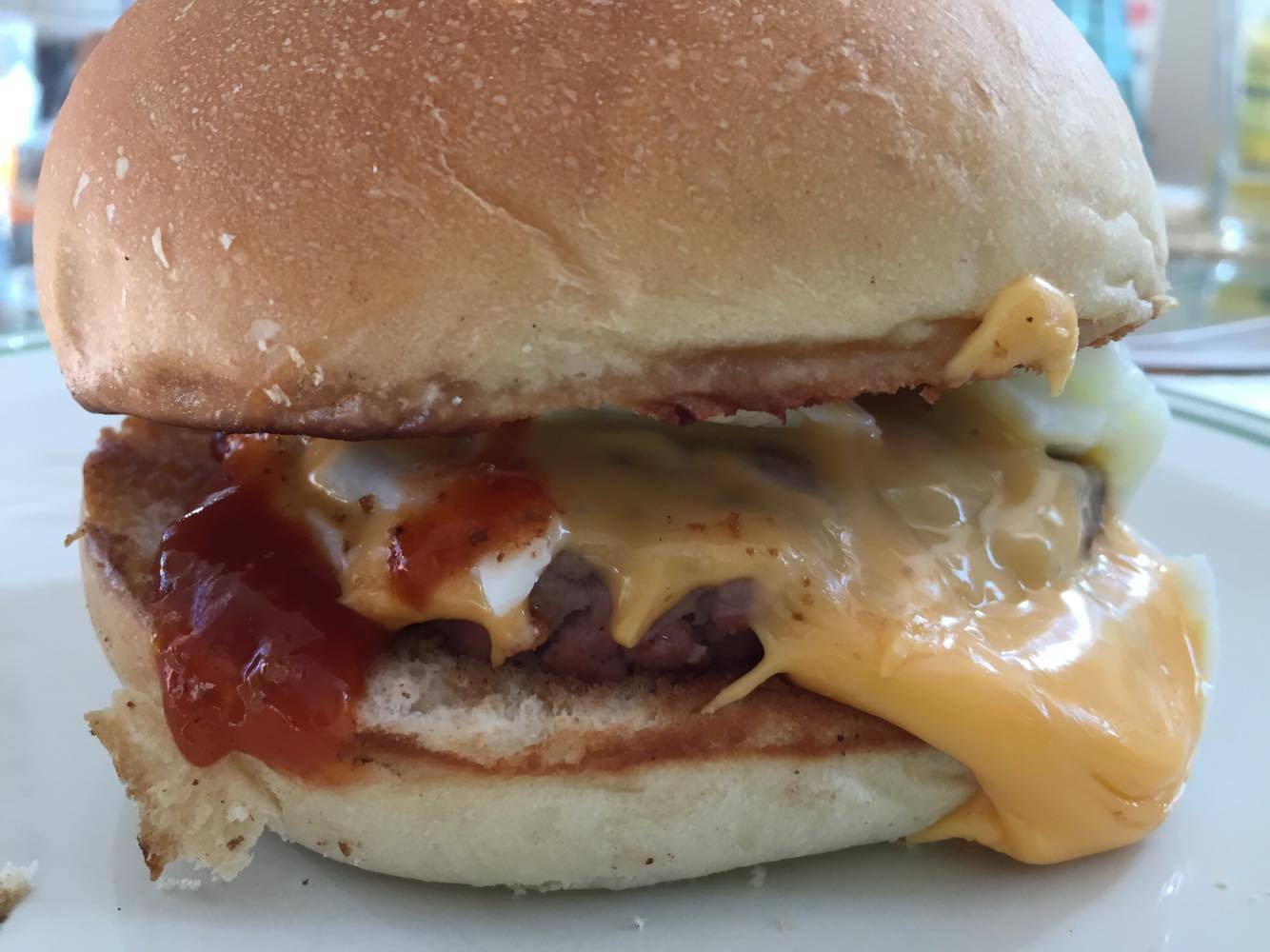 Burger con uovo, hamburger, formaggio cheddar, insalata, pomodoro, maionese, barbecue e patatine