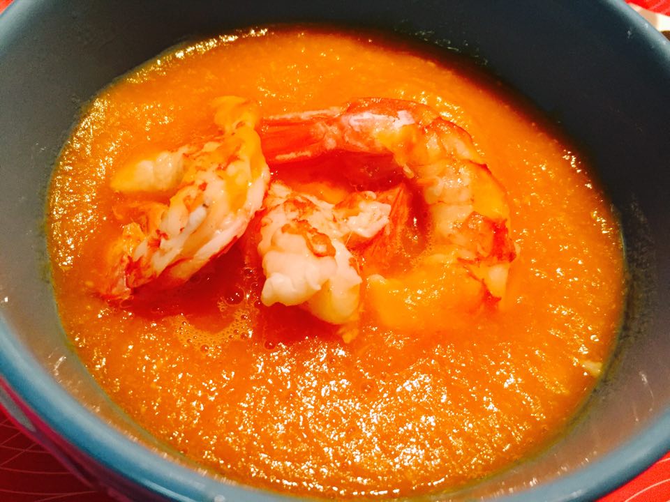 Crema di Zucca con carote, zenzero e gamberi cucinati a vapore…