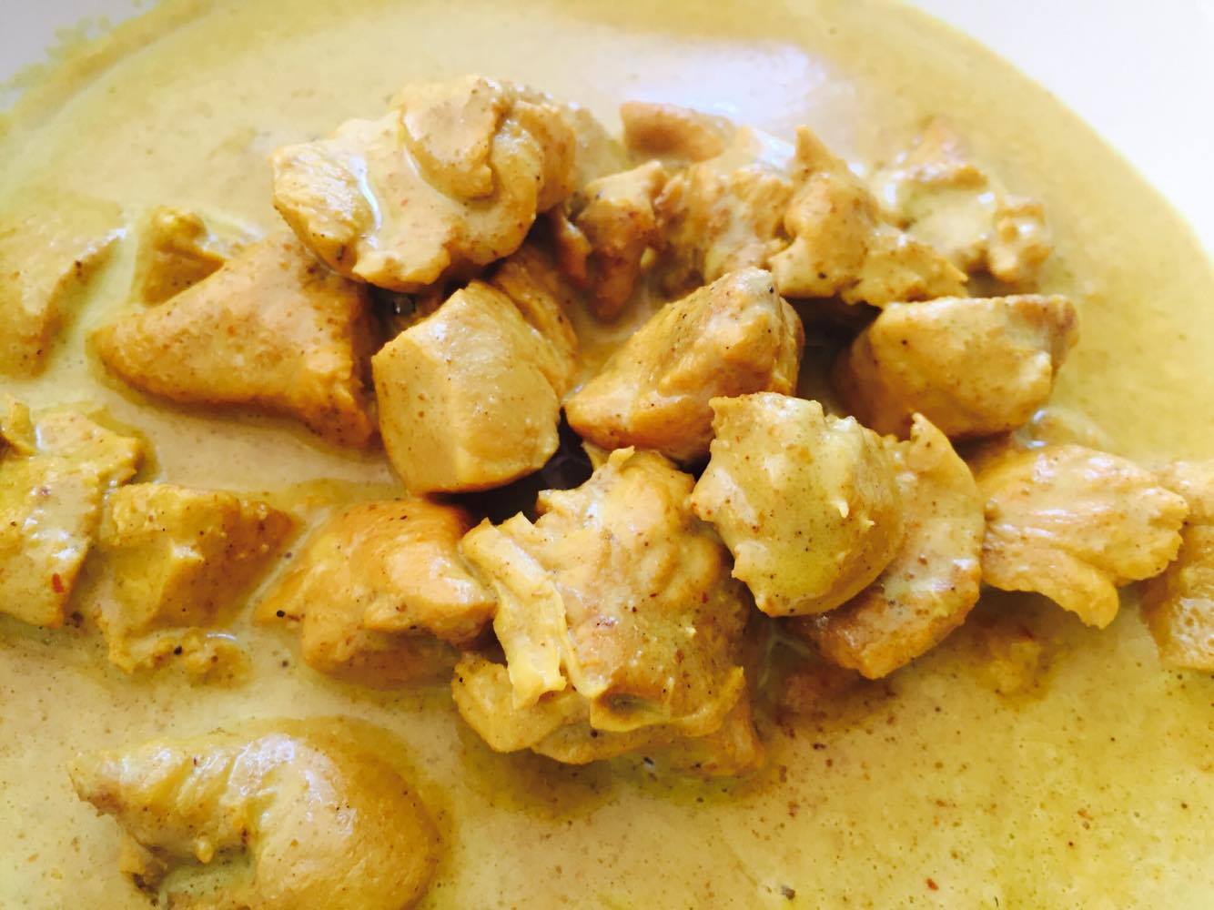 3.Aggiungete il curry e tre cucchiai di brodo di pollo e fate cucinare a fuoco basso
