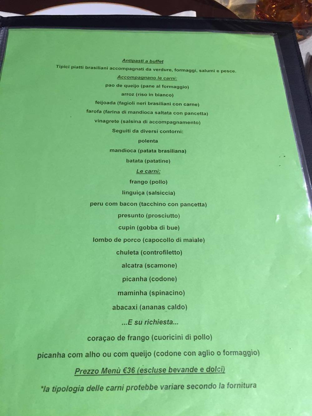 La particolarità di questo ristorante è la carne e come viene cucinata e servita… Come potrete vedere dal menù offrono 10 tipi di carni diverse le quali vengono tutte servite al tavolo in momenti diversi…