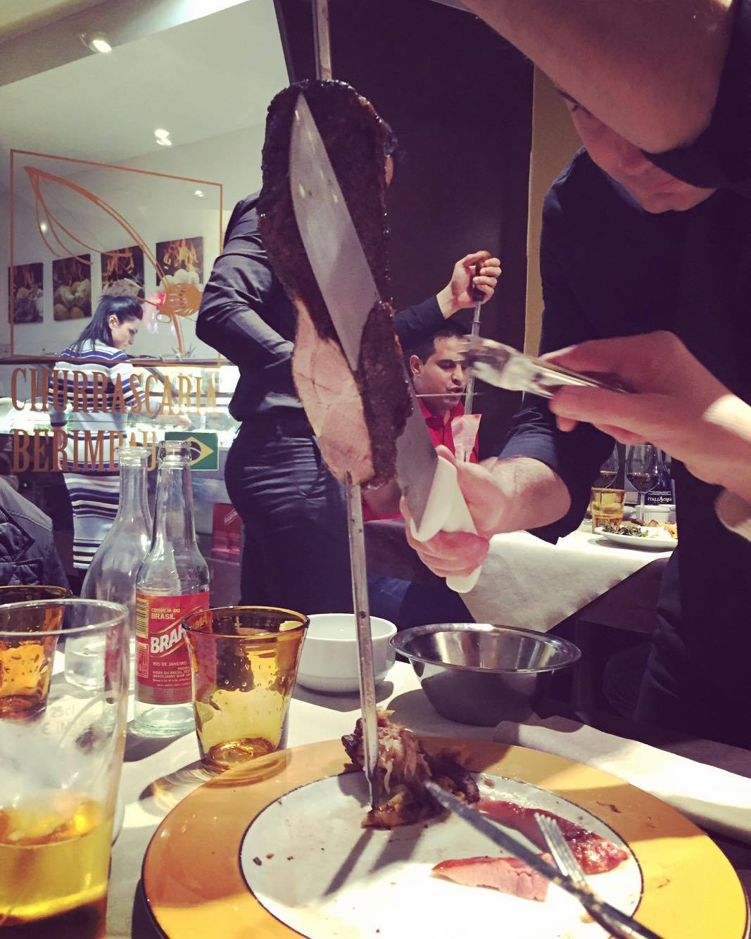 La carne viene cucinata allo spiedo e viene servita al tavolo… Il cameriere viene al tavolo con la carne la quale verrà tagliata al momento nel vostro piatto e dovrete usare delle pinze per prenderla.. come potete vedere nella foto…