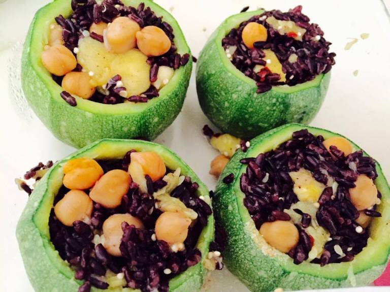 Zucchine ripiene di riso venere, ceci, zucchine e quinoa…