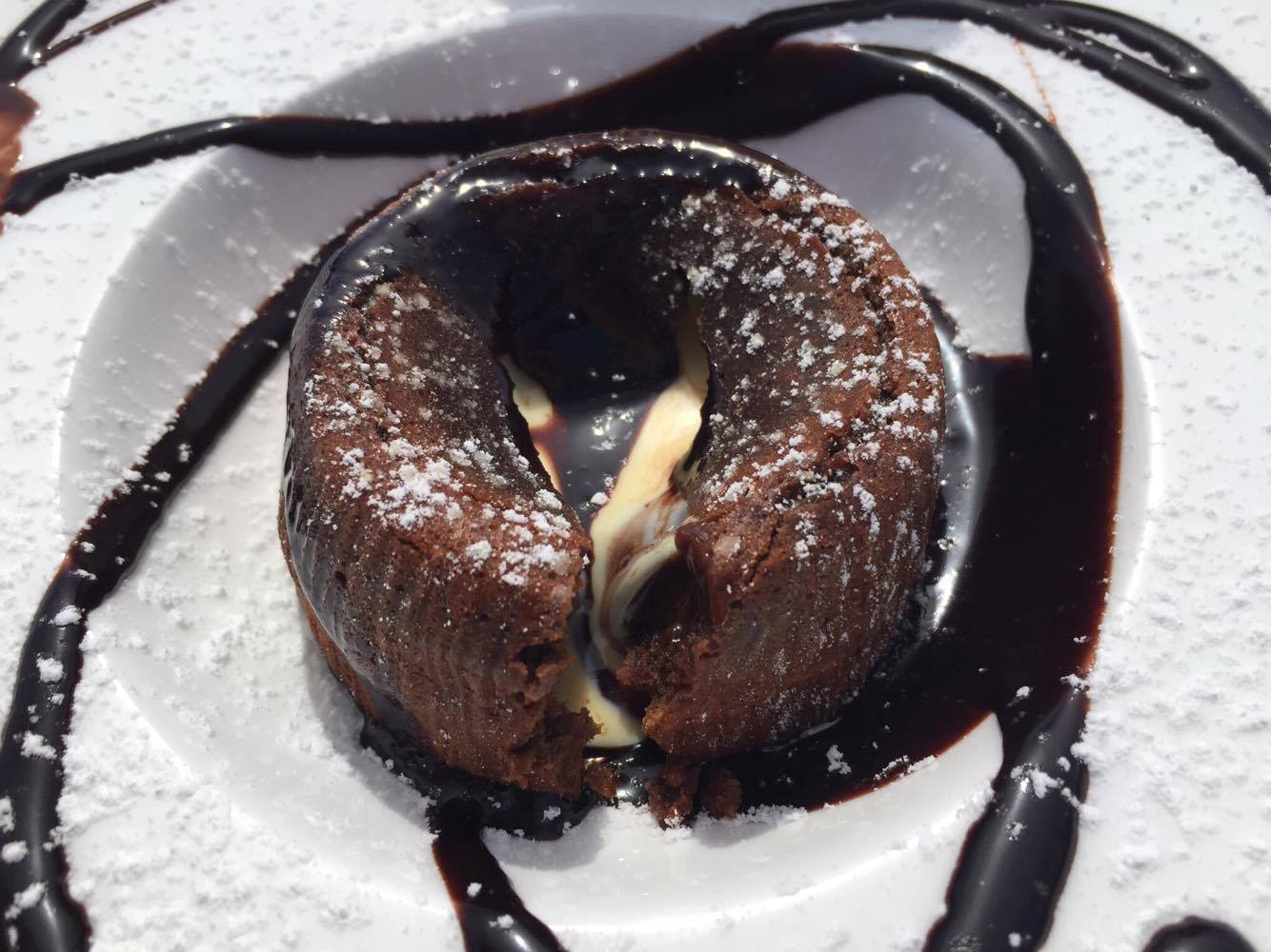 Tortino caldo al cioccolato fondete con cuore di cioccolato bianco caldo