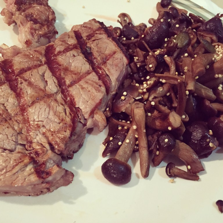 My dinner today is filet mignon and mushrooms… in order to give some additional taste I added some quinoa and pumpkin seeds to my vegetables…