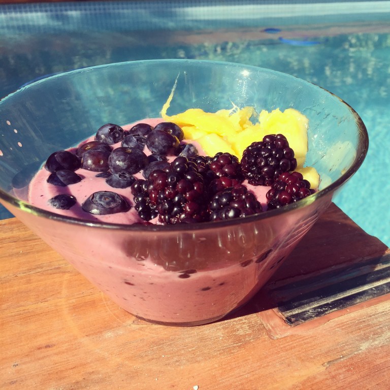 I did it at home and my smoothie base was done with greek blueberry yogurt, kiwi and strawberries… the top with blueberries, blackberries and mango…then I added granola, dried coconut and almonds…