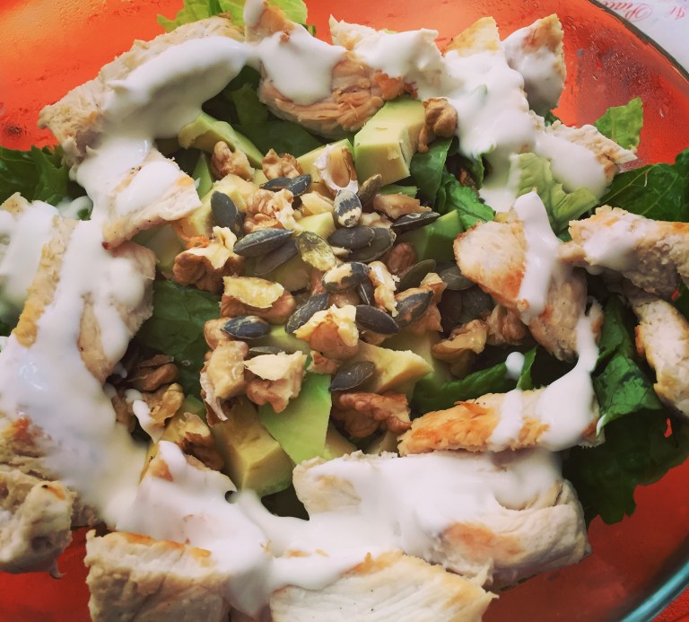 Delicious salad with avocado, chicken breast, seeds and sour cream…