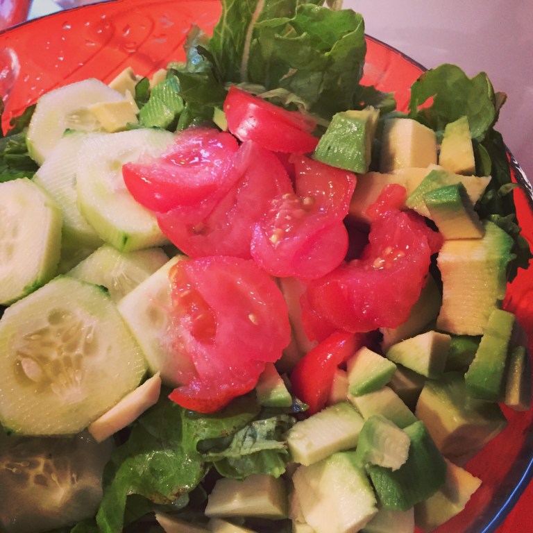 This time I decided to add cucumbers to my salad with avocado and tomatos…