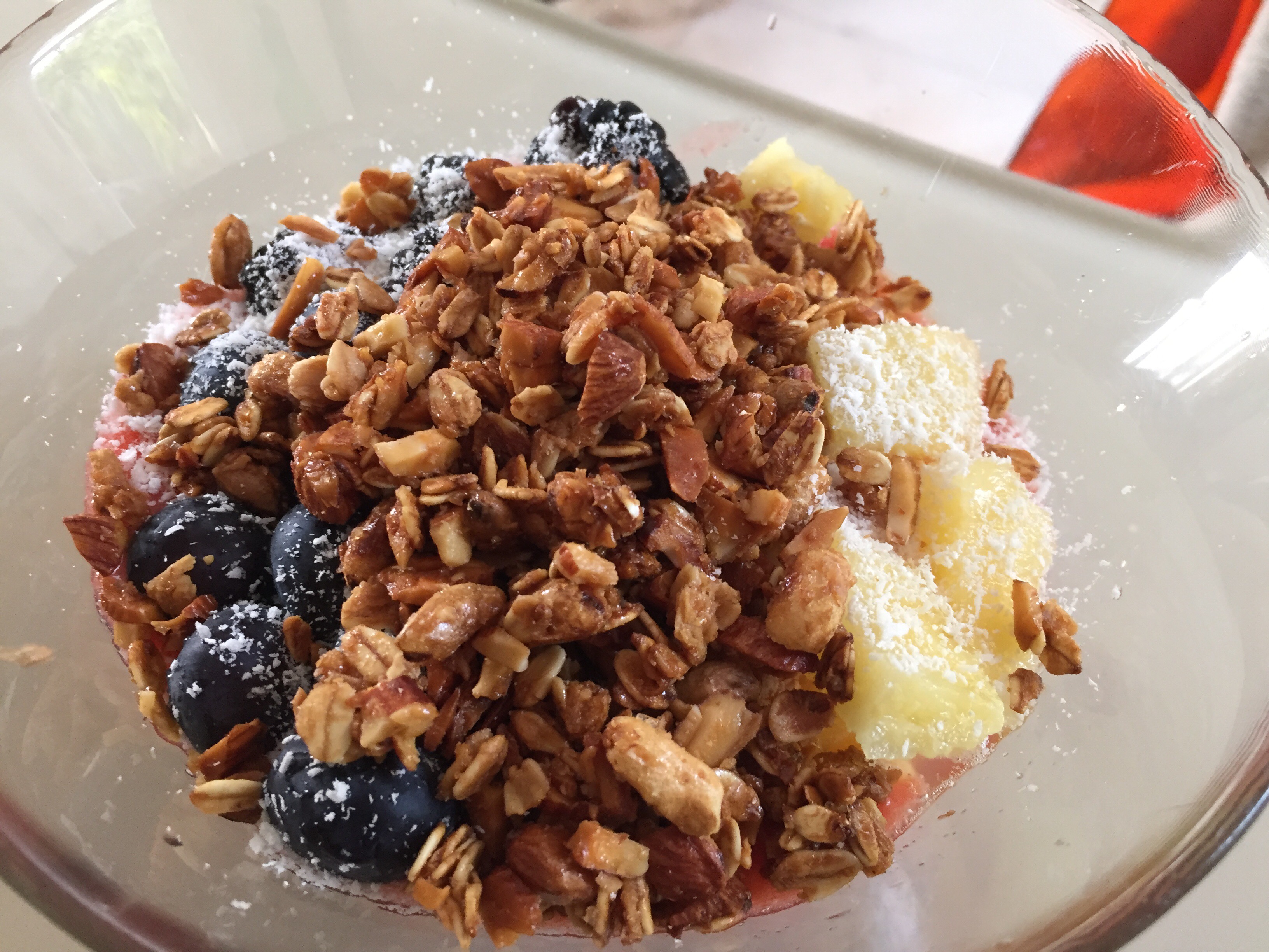 My smoothie bowl base is made up of mango, strawberries and half cup of almond milk, while for the toppings I used pineapple, blueberries, blackberries, granola and raw coconut flakes…