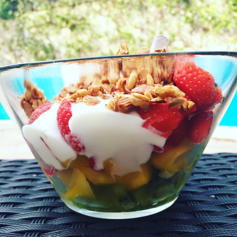 Breakfast bowl with peach, kiwi and strawberries…Add some yogurt and granola in order to give more taste…