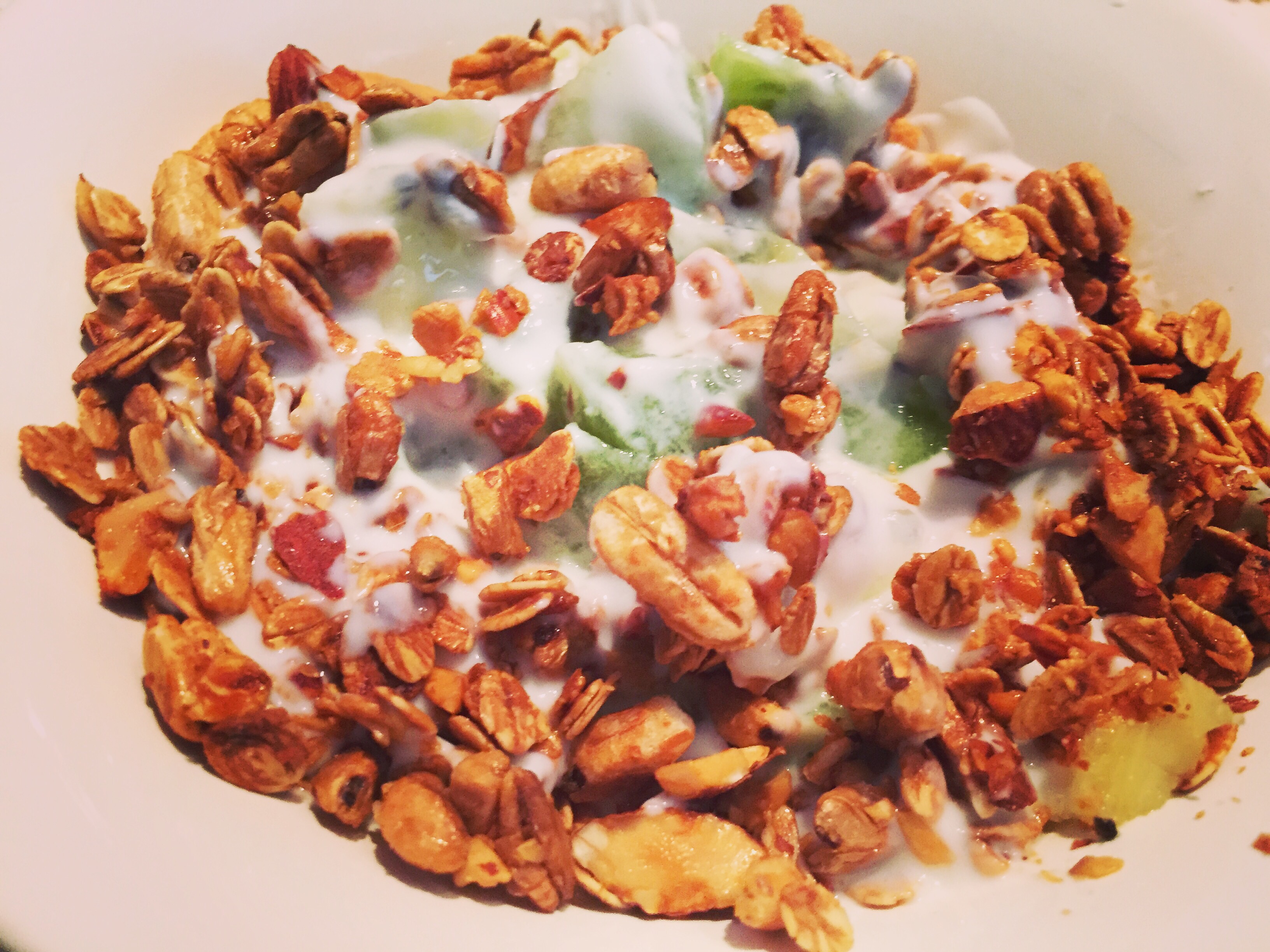 Good morning, for breakfast today I decided to have just kiwi, low fat yogurt and granola… What about you?
