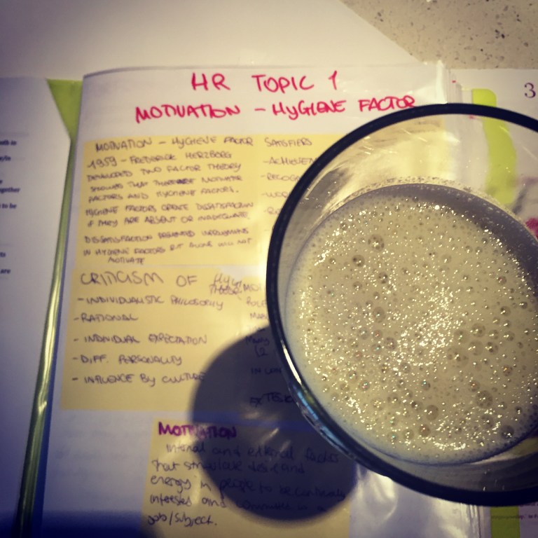 Today my day starts with a review for my HR exam on motivation and a lovely smoothie…