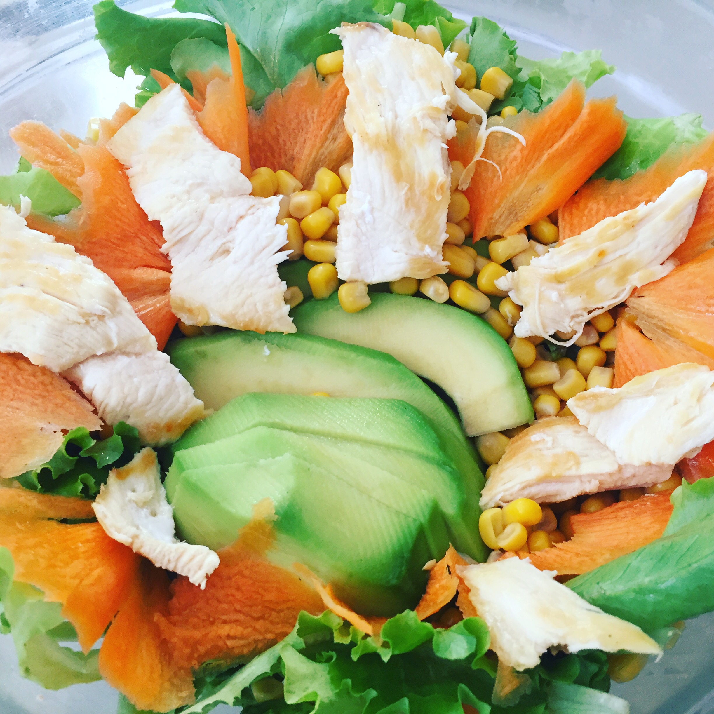 Today’s salad is made of avocado, corn, carrots and chicken…