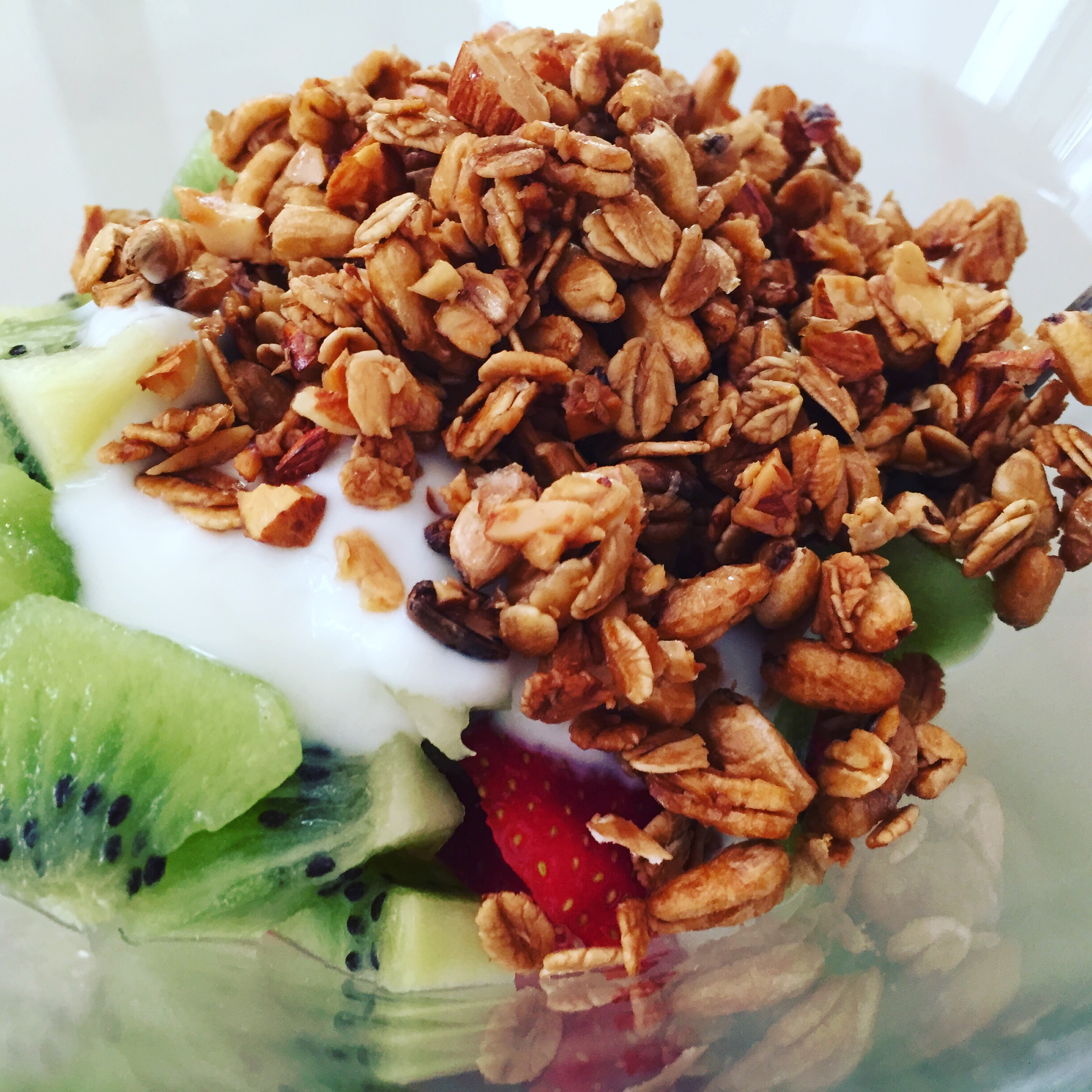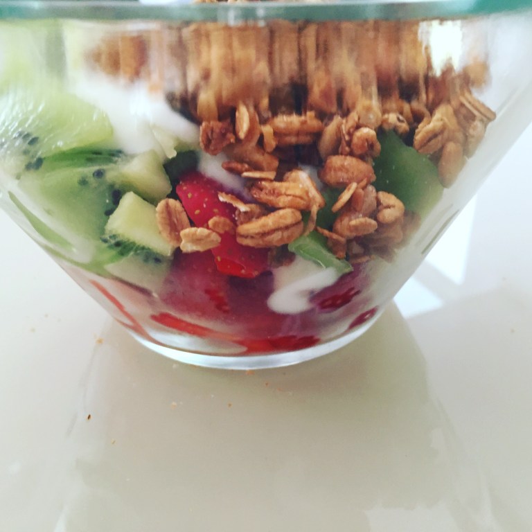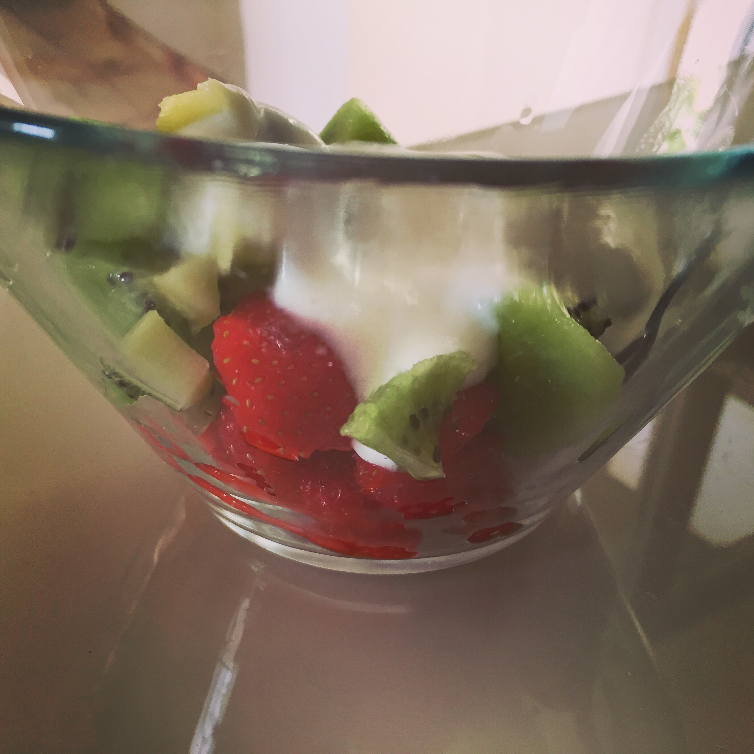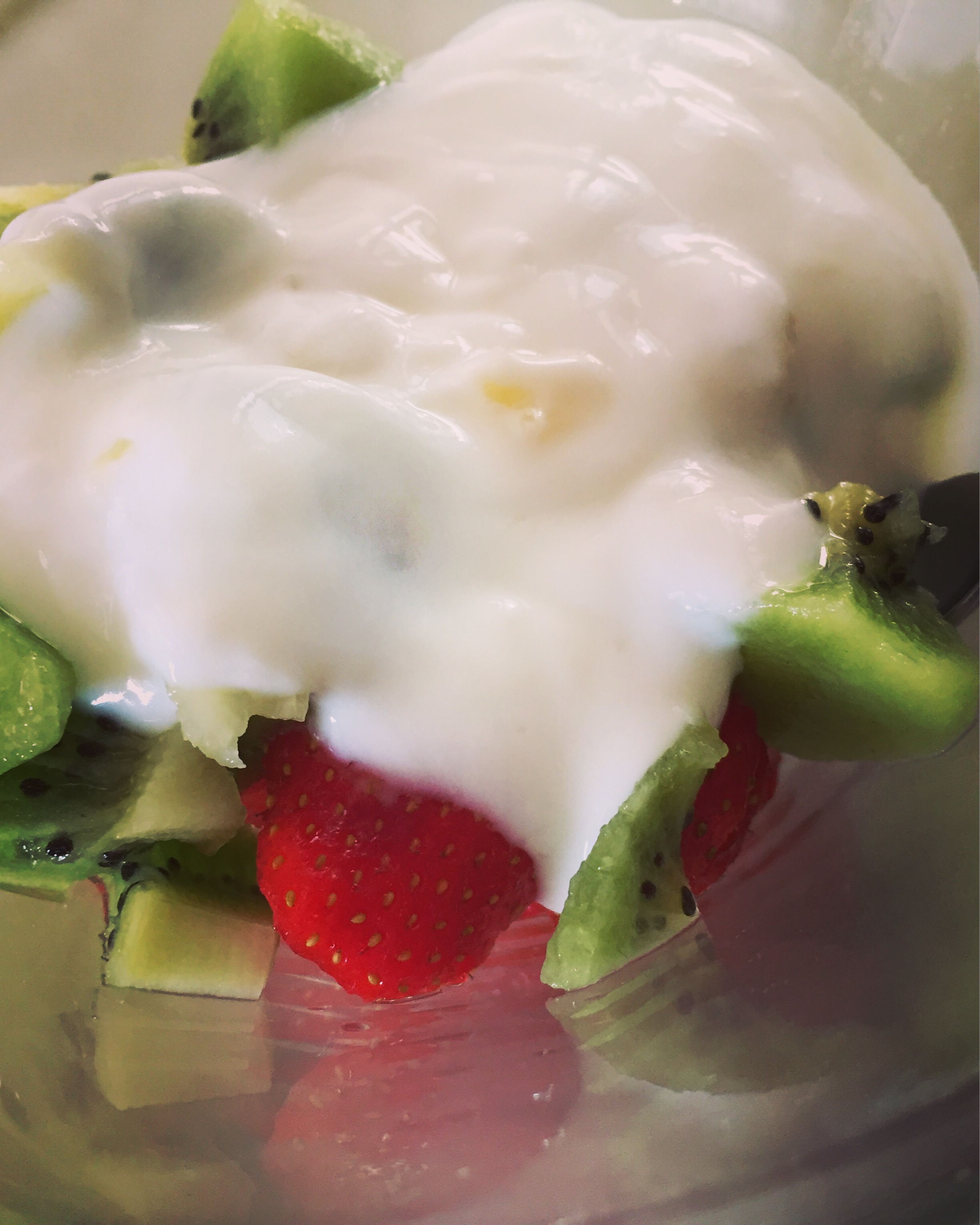 Just two ingredients for breakfast… Kiwi and Strawberries, then add a fruit yogurt and granola… Your breakfast is complete…