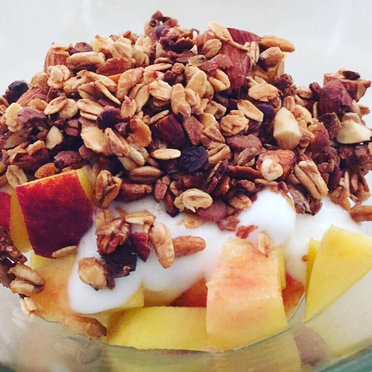 In order to have a balanced breakfast it’s appropriate to add something to the fruit… I added low fat yogurt and homemade granola…