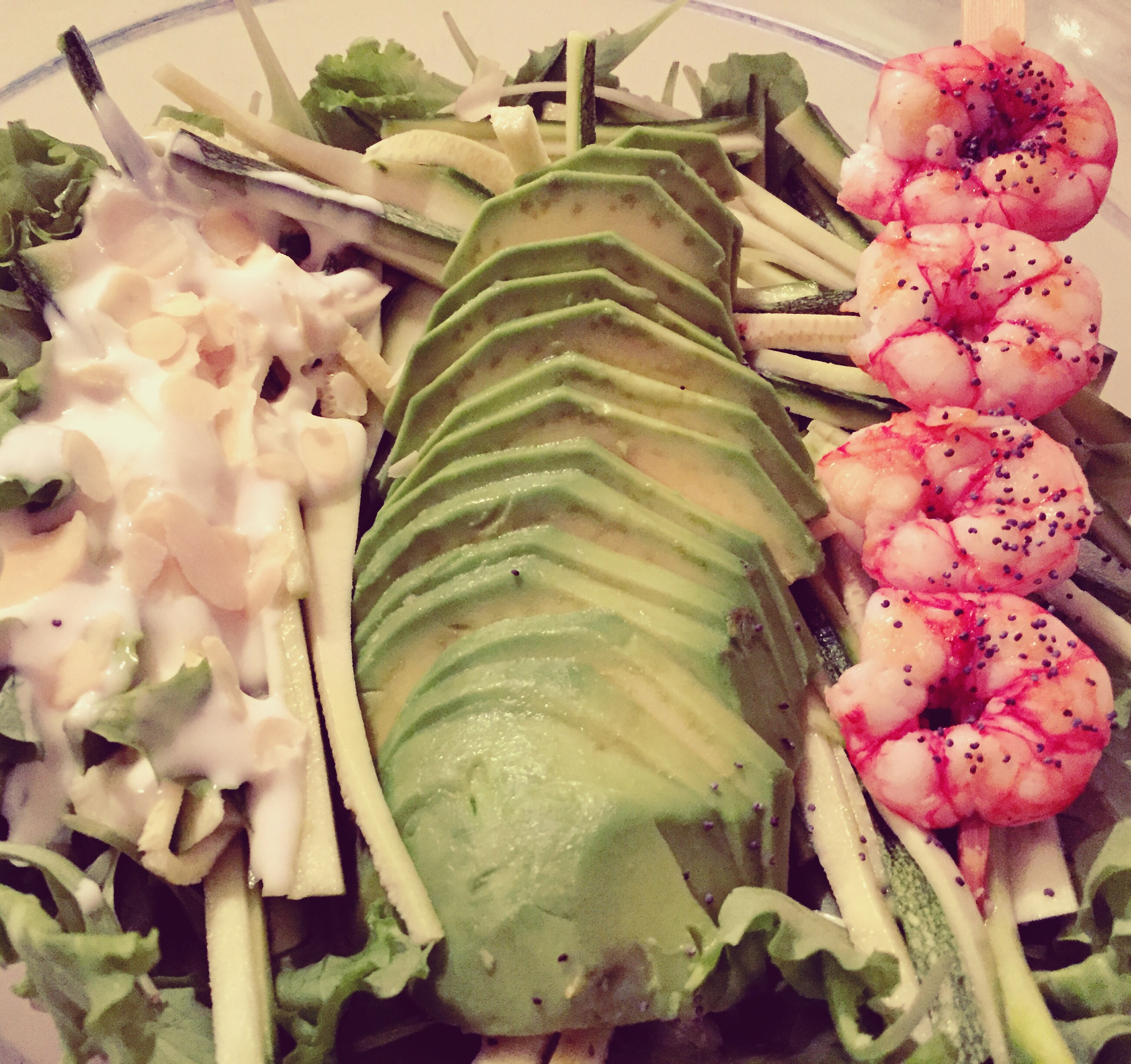 Healthy dinner made up of salad with shrimps, avocado, dressing and almond…