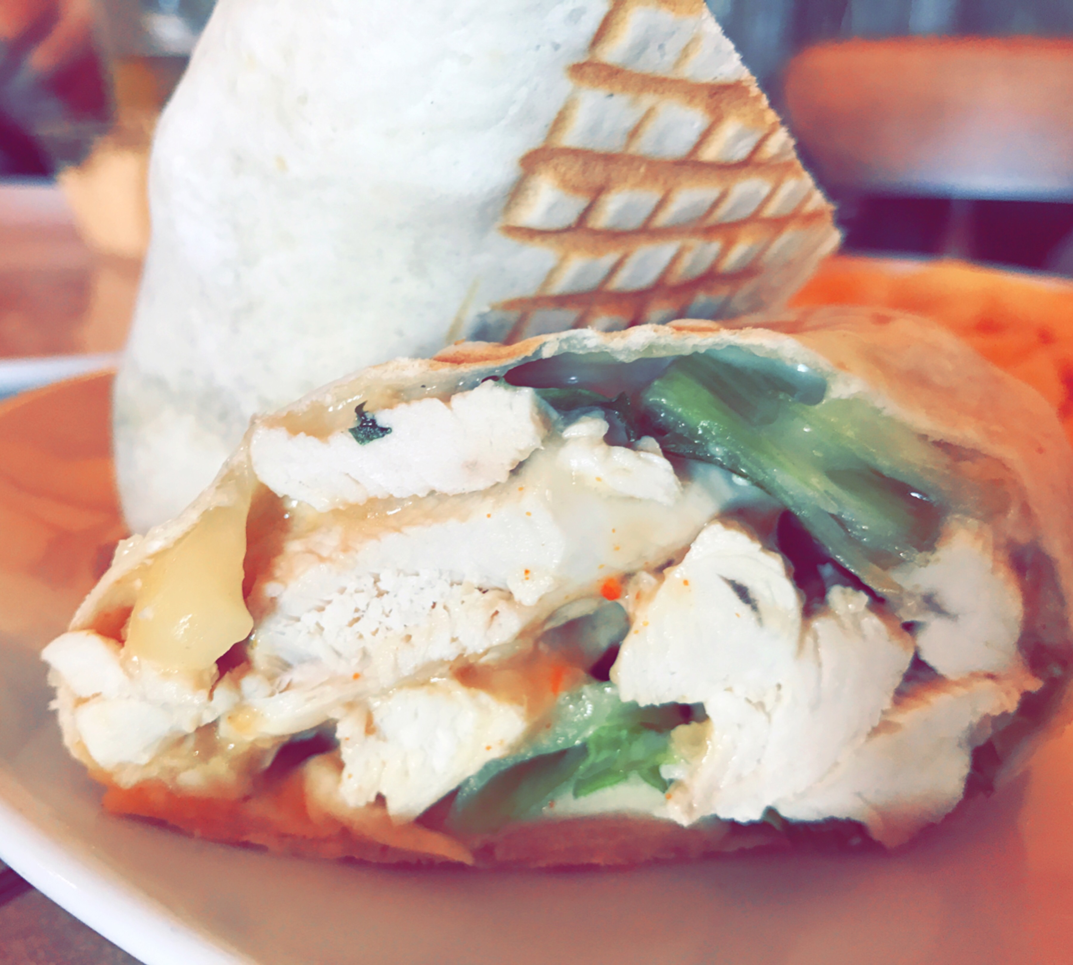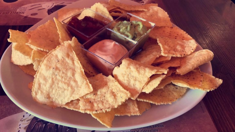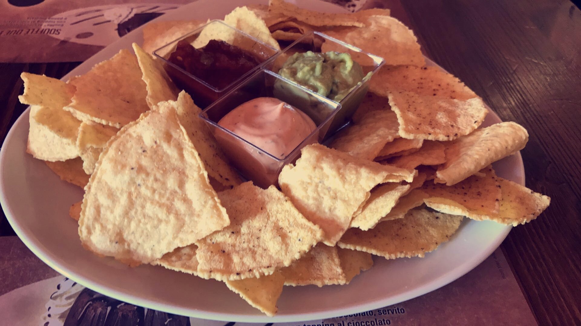 Delicious Mexican style lunch composed of nachos as starter and chicken wrap…