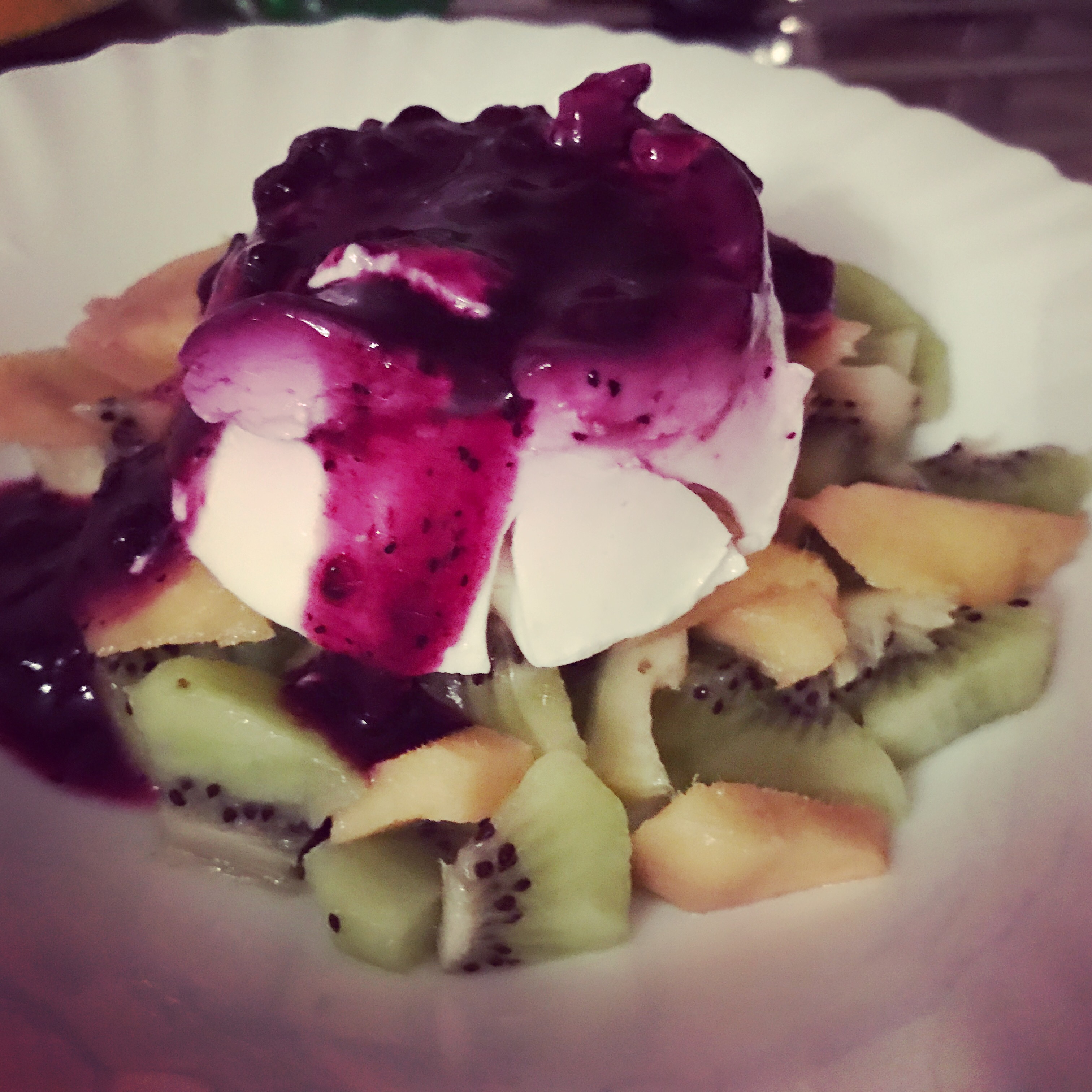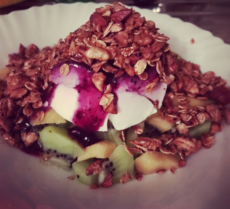 My healthy breakfast is composed by kiwi, mango, oikos greek low fat yogurt with blueberry jam and homemade granola…