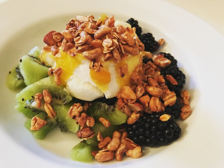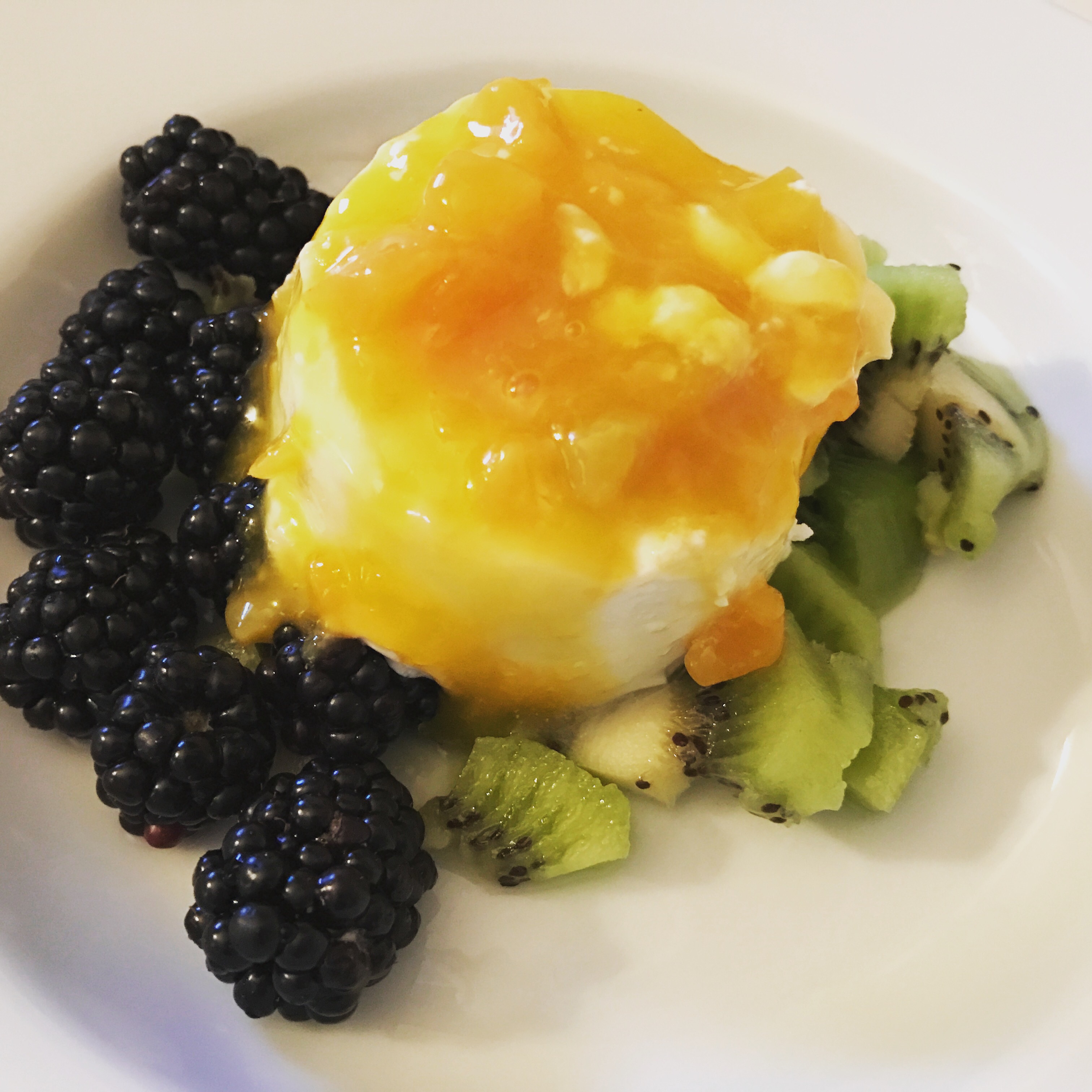 My breakfast in fact is made up of fresh fruit, such as kiwi and blackberries, while my low fat greek yogurt (oikos) has a bit of peach jam…