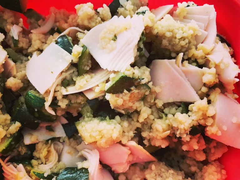 Today for lunch I prepared myself some Cous Cous with zucchini, turkey and a small spoon of pesto sauce…