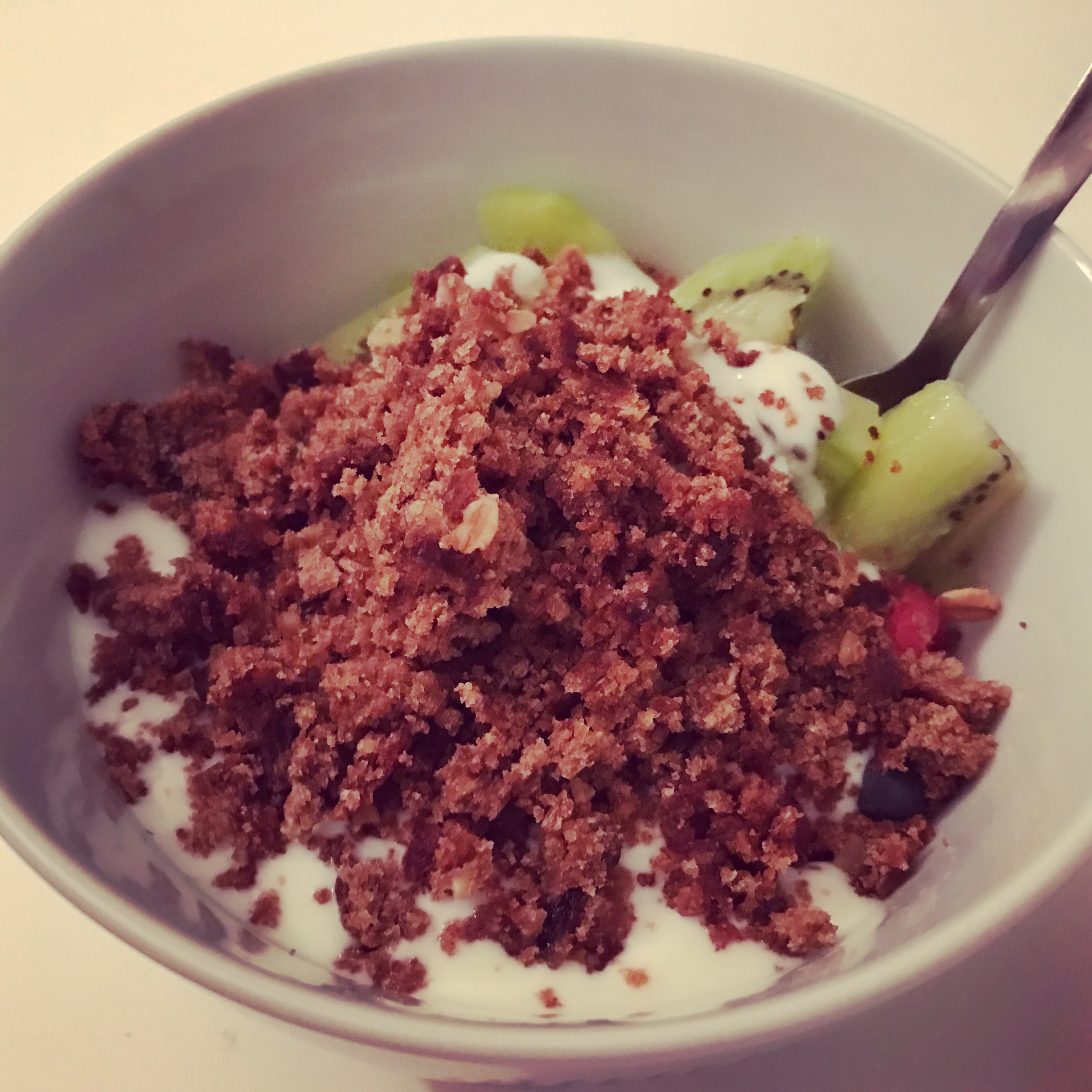 Today’s breakfast is made up of blackberries, raspberries, low fat yogurt and all bran snack crumbles…