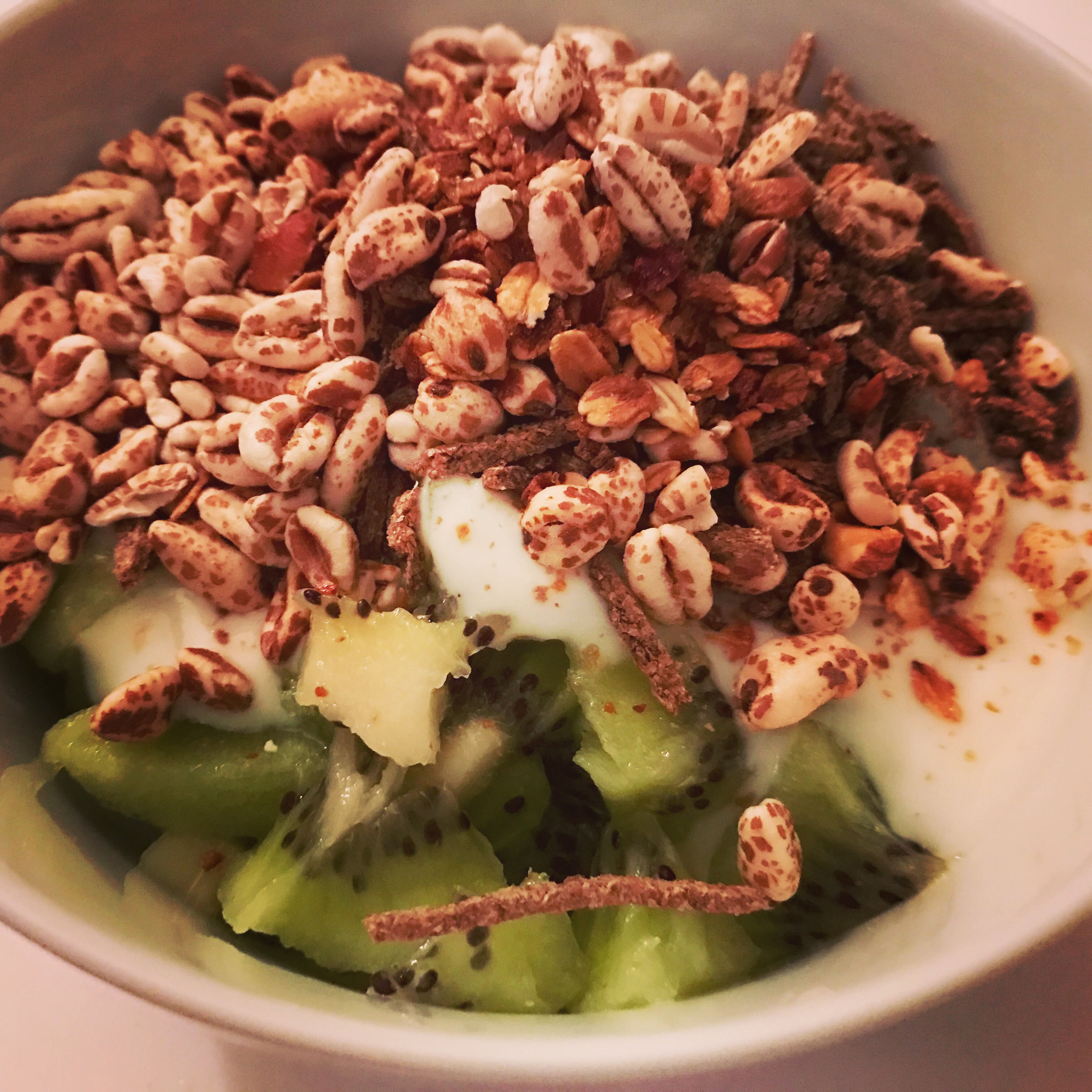 My lovely breakfast made up kiwi, low fat white yogurt (Muller), all bran sticks cereals and puffed rice…
