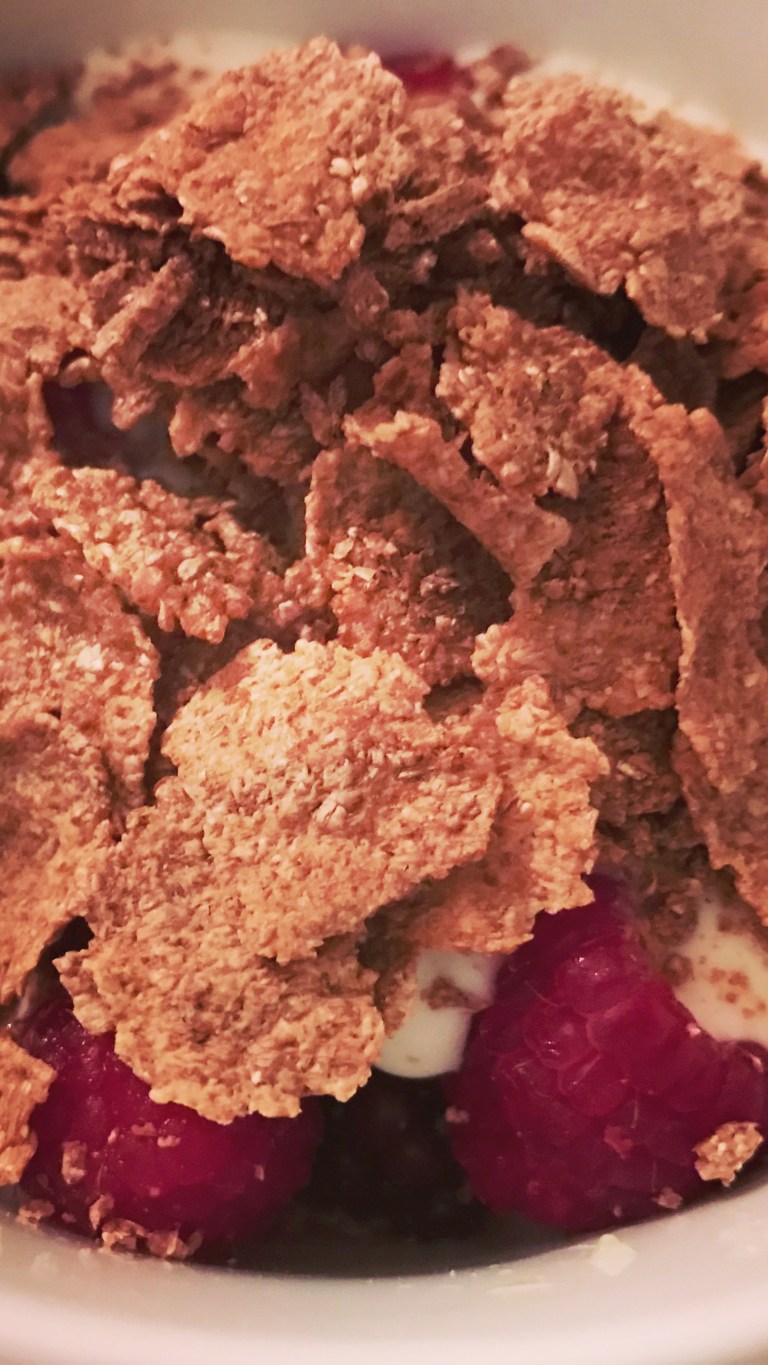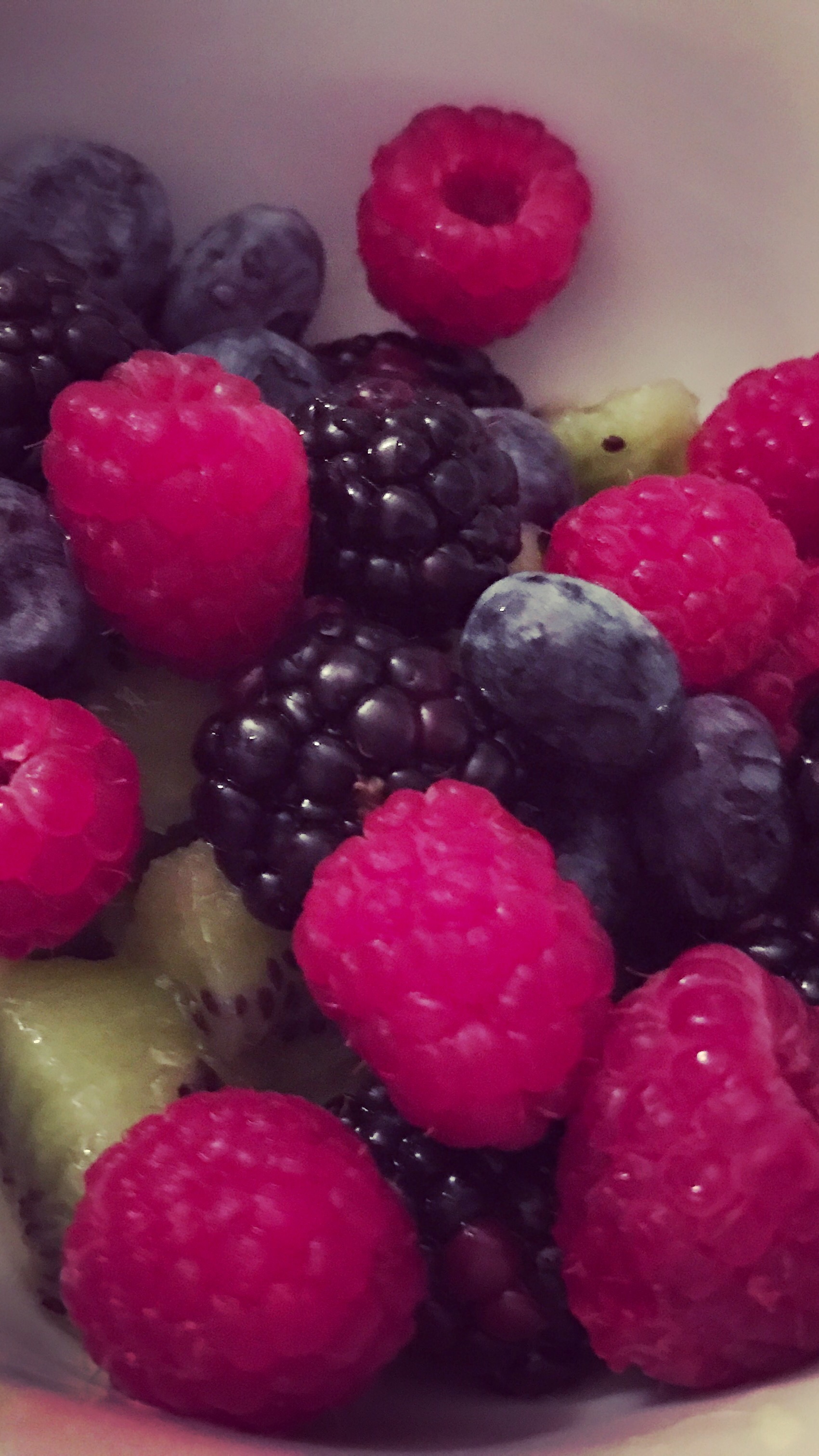 Blueberries, blackberries, raspberries and kiwi… then I added low fat white yogurt ( Müller) and some mixed cereals…