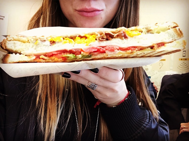 Il Club Toast è più pesante ma è pura goduria visto che ha tre strati ed è composto da bacon, frittatina, fesa di tacchino, formaggio, insalata, pomodoro, maionese…