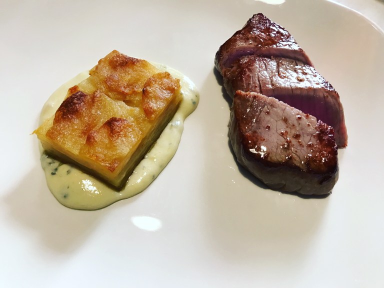 Scamone di vitella con millefoglie di patate e fonduta al blu del montecenesino…
