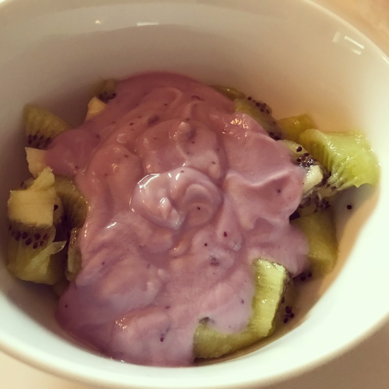 Oggi ho optato per una colazione semplice… un paio di kiwi, yogurt di soia al mirtillo e cereali All Bran…