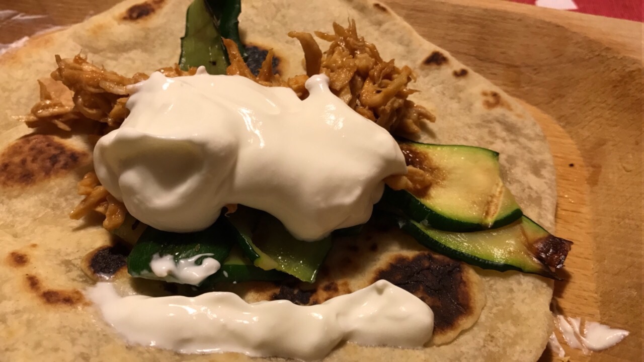 Piadina e panna acida homemade, pollo alla salsa barbecue e zucchine grigliate…