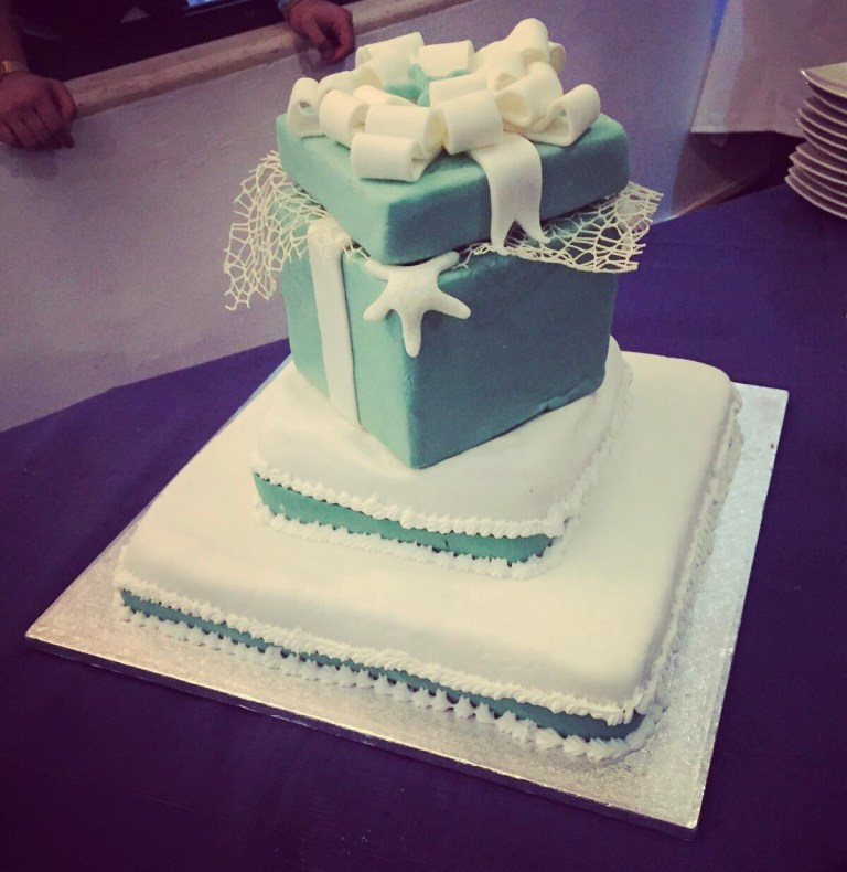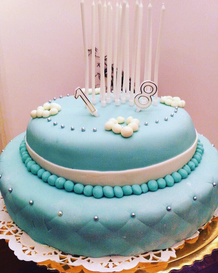 Tiffany Cake: torta pan di spagna, farcita con crema pasticciera e ricoperta di pasta di zucchero