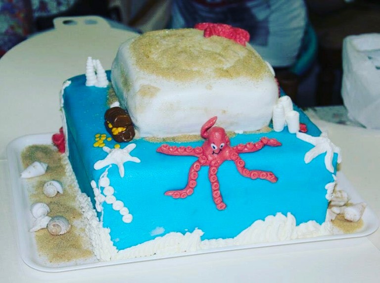 Sea Cake: torta pan di spagna classico, farcita con crema pasticciera e gocce di cioccolato e ricoperta di pasta di zucchero