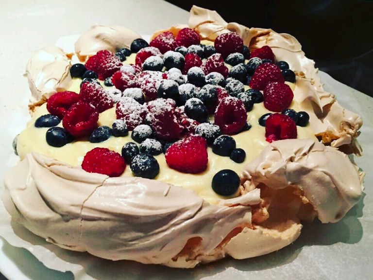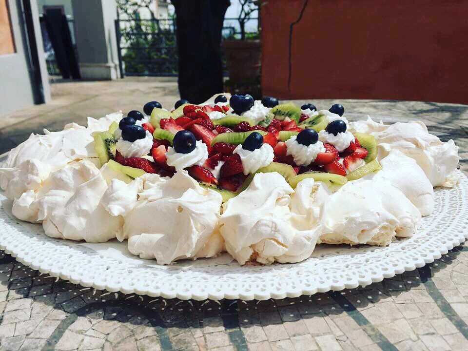 Pavlova: torta con base di meringa ripiena di crema chantilly e frutti di bosco o frutta fresca
