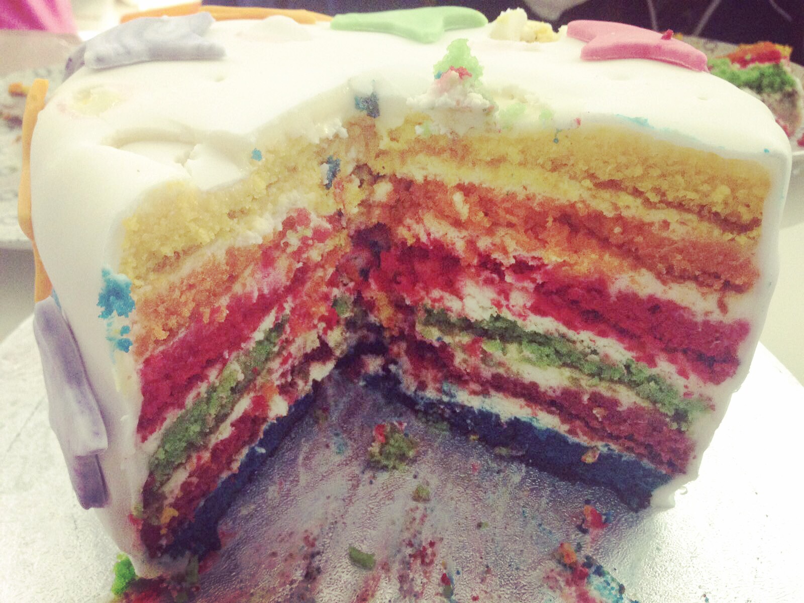 Rainbow Cake: torta pan di spagna multicolor, farcita con crema al mascarpone e ricoperta di pasta di zucchero