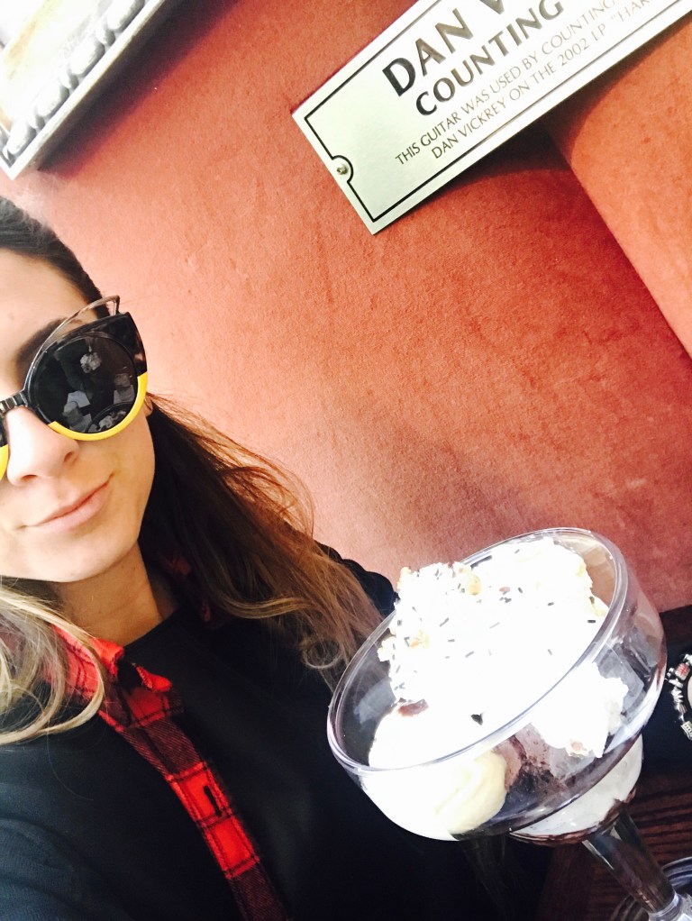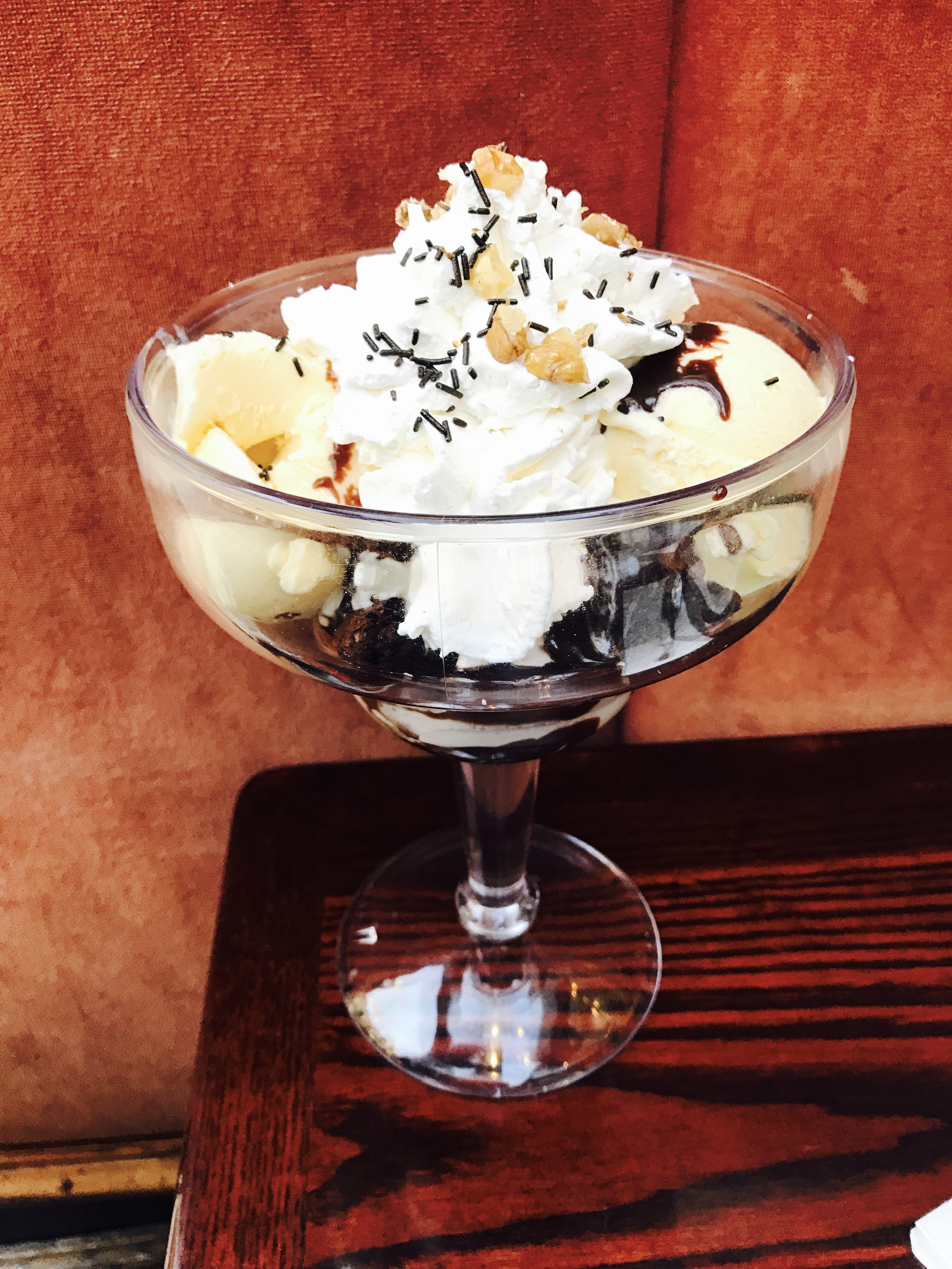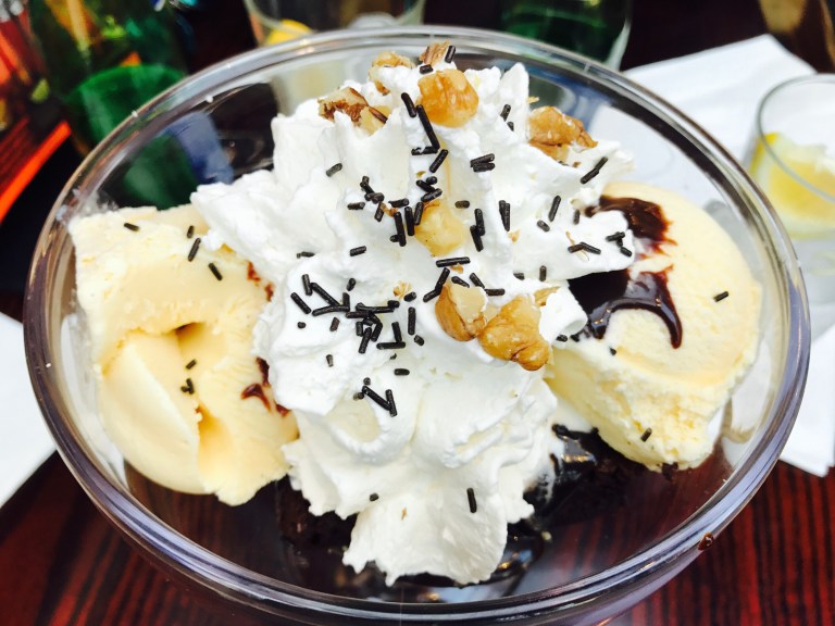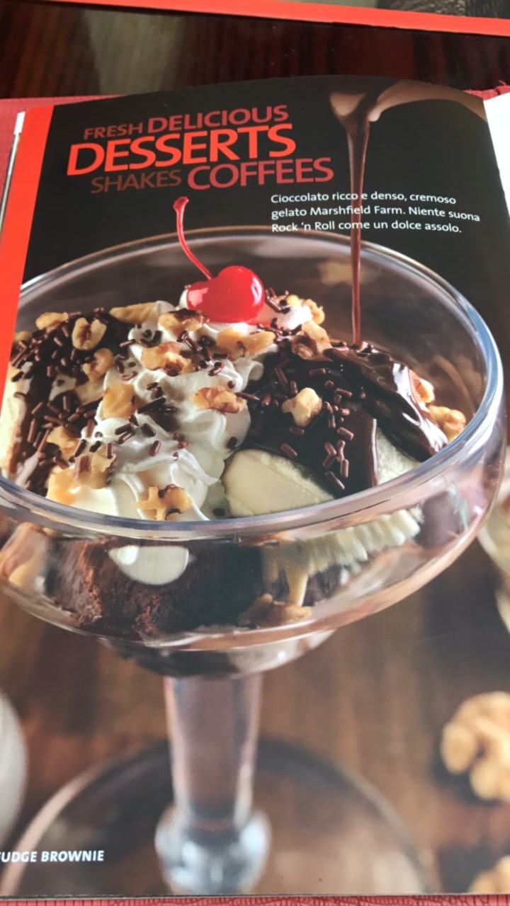 Un delizioso dessert, hot & cold, un fantastico brownie caldo ricoperto di gelato alla vaniglia, cioccolato, noci, stecchine di cioccolato e panna…