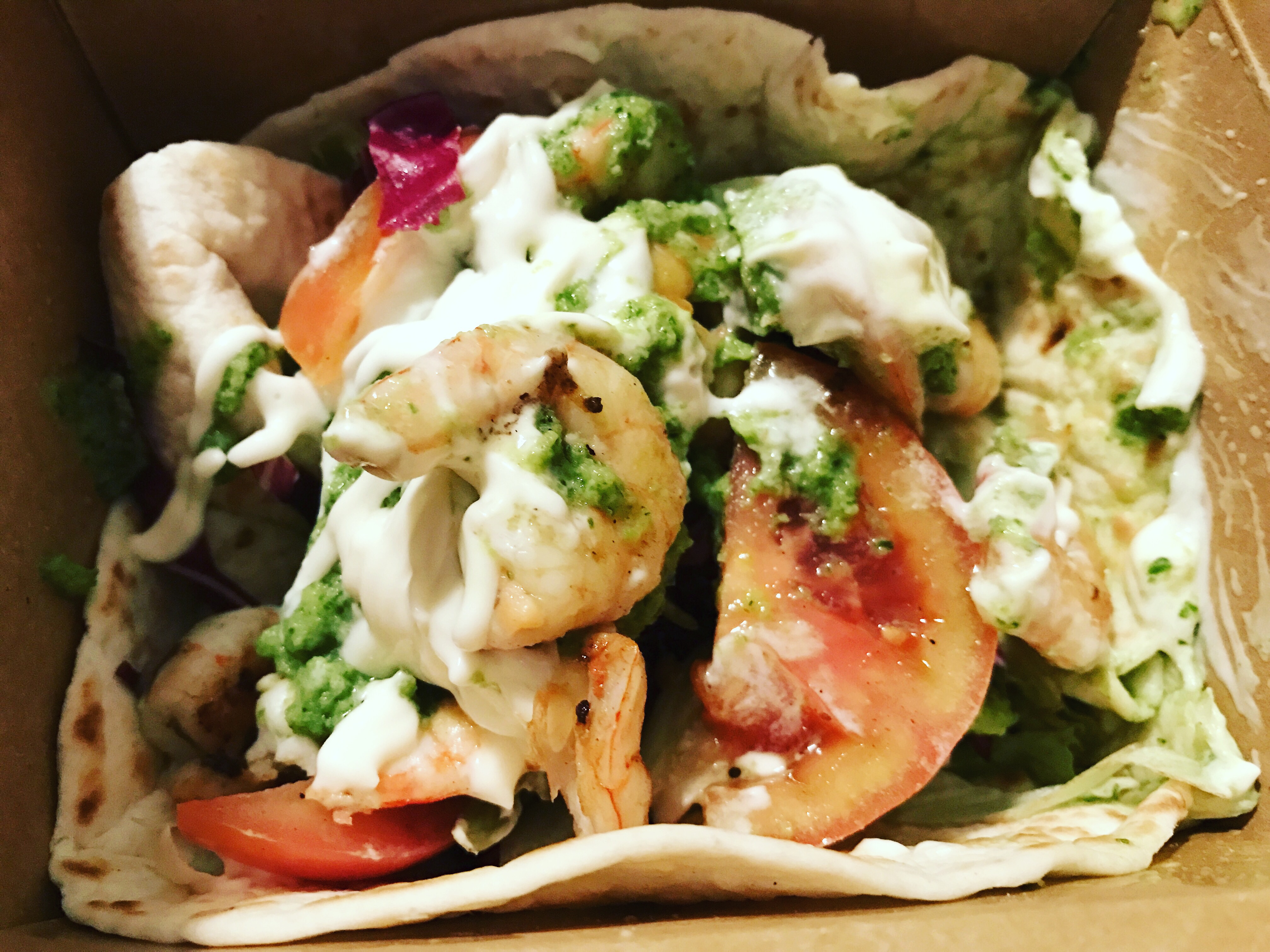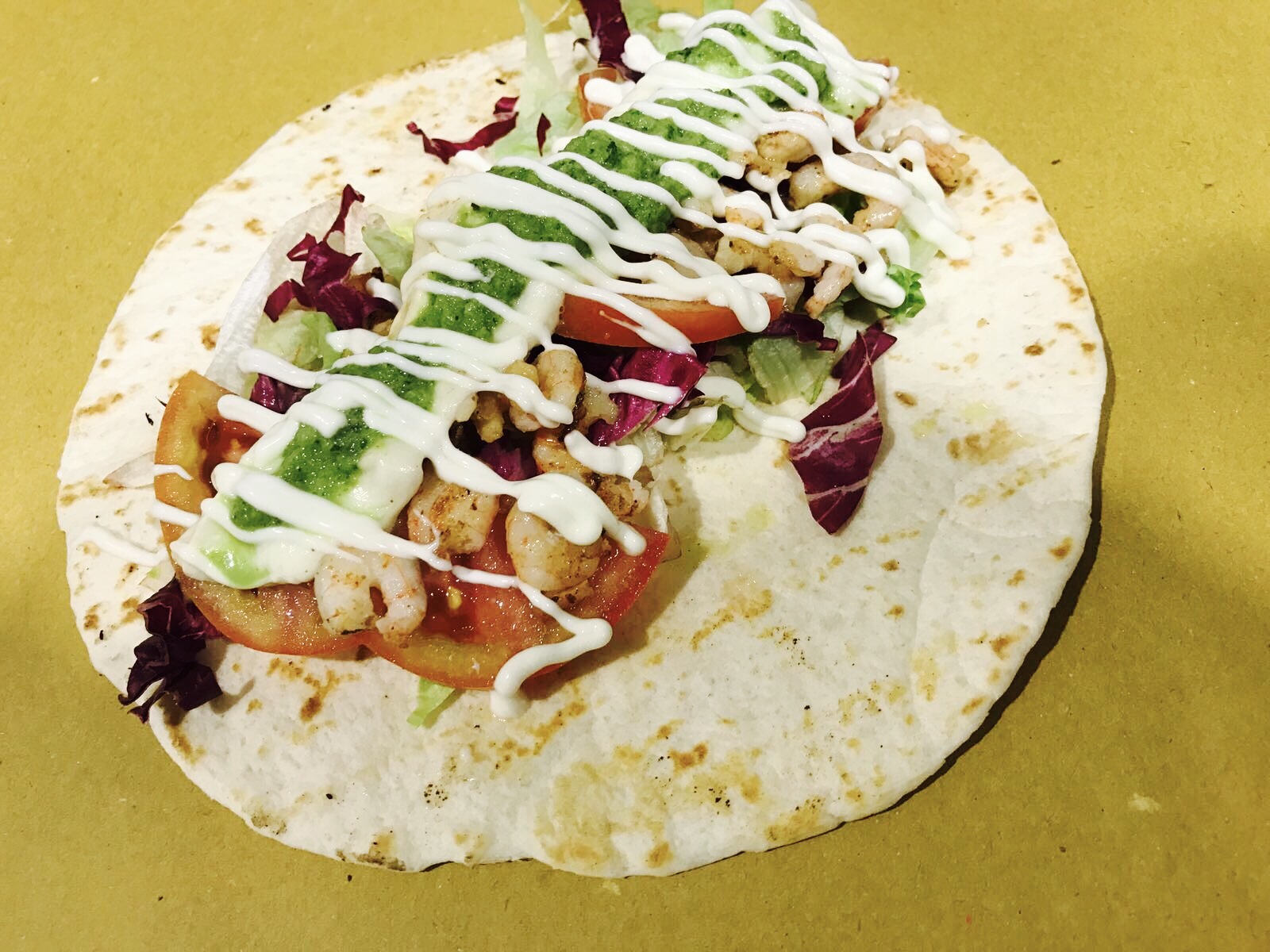 Tacos con gamberetti scottati sulla piastra, insalata, pomodoro, maionese e pesto di zucchine…