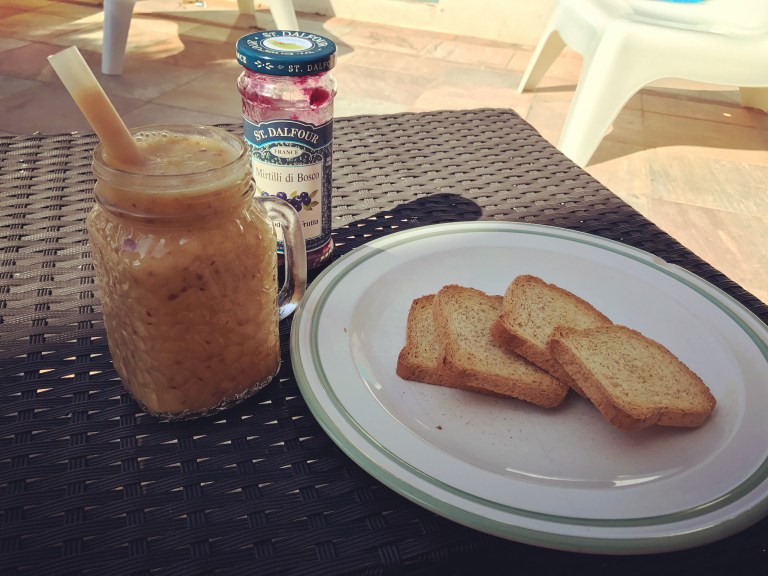 With a delicious and healthy breakfast composed of a lovely peach smoothie and melba toast and jam…