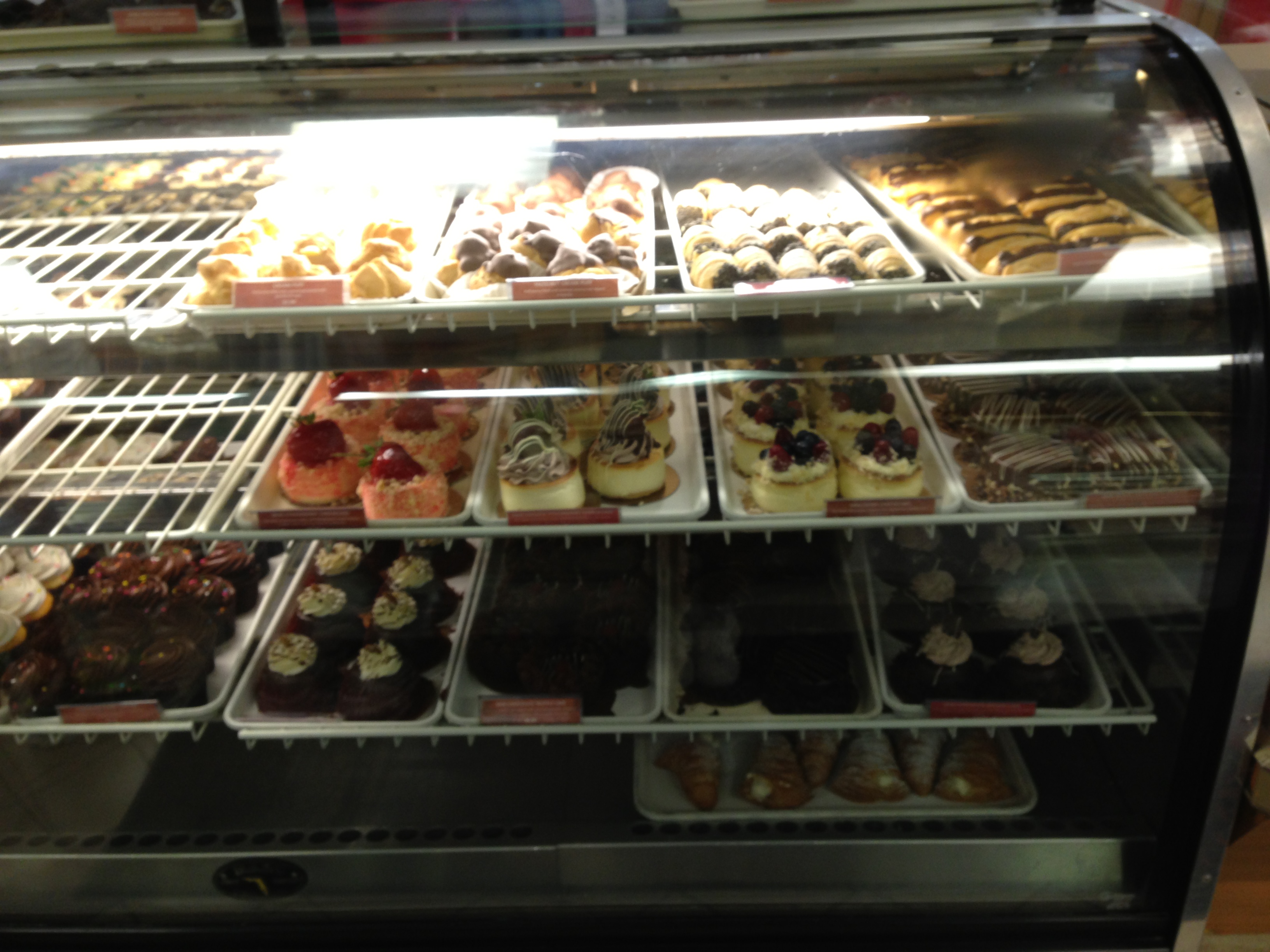 Pastries: brownie with and without nuts, cannoli, chocolate cannoli, lobster tail, tarts, cream puff…