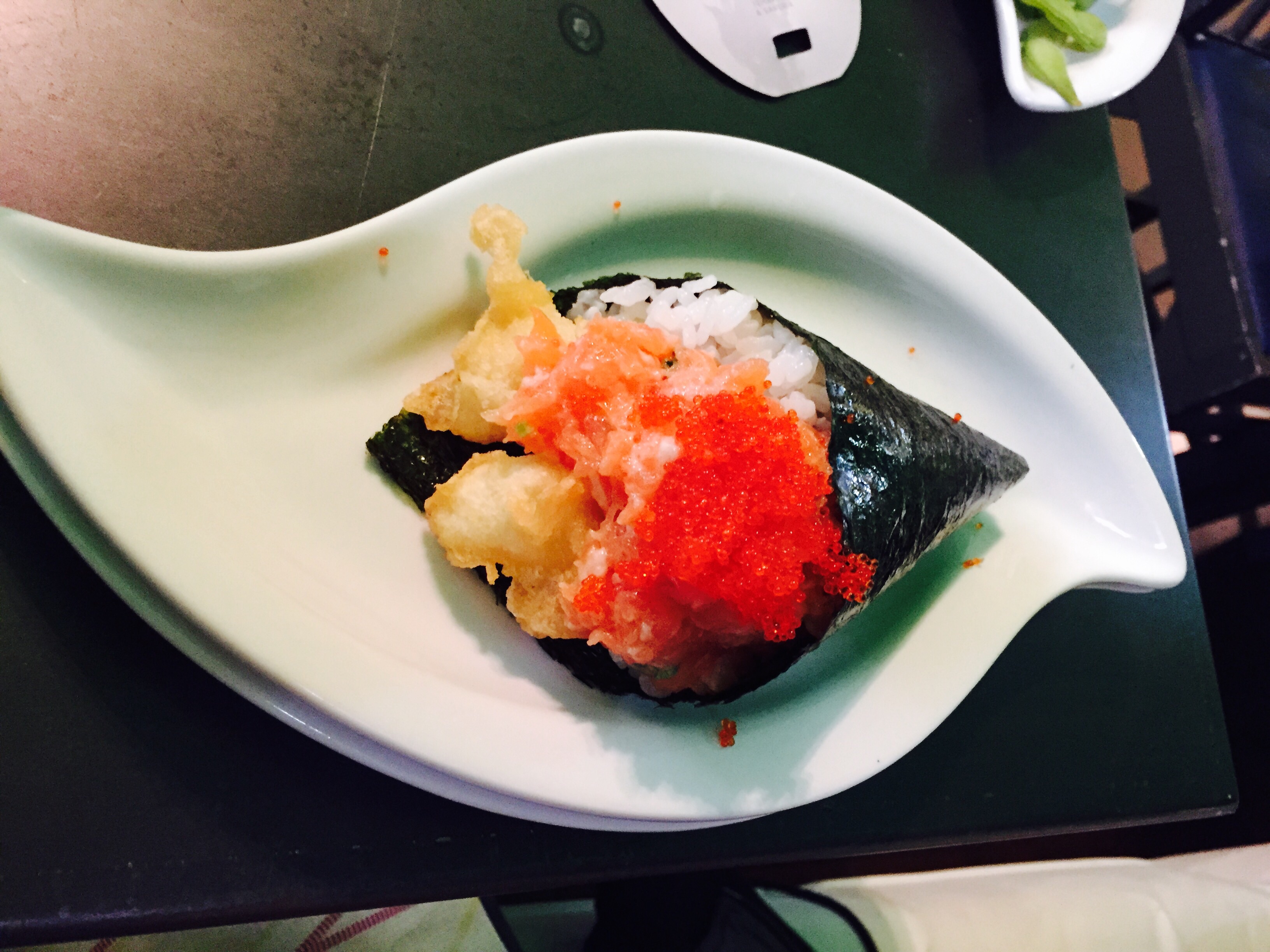 Ipnema: Tempura shrimps, tobiko orange, salad, tsunami sauce, surimi e avocado