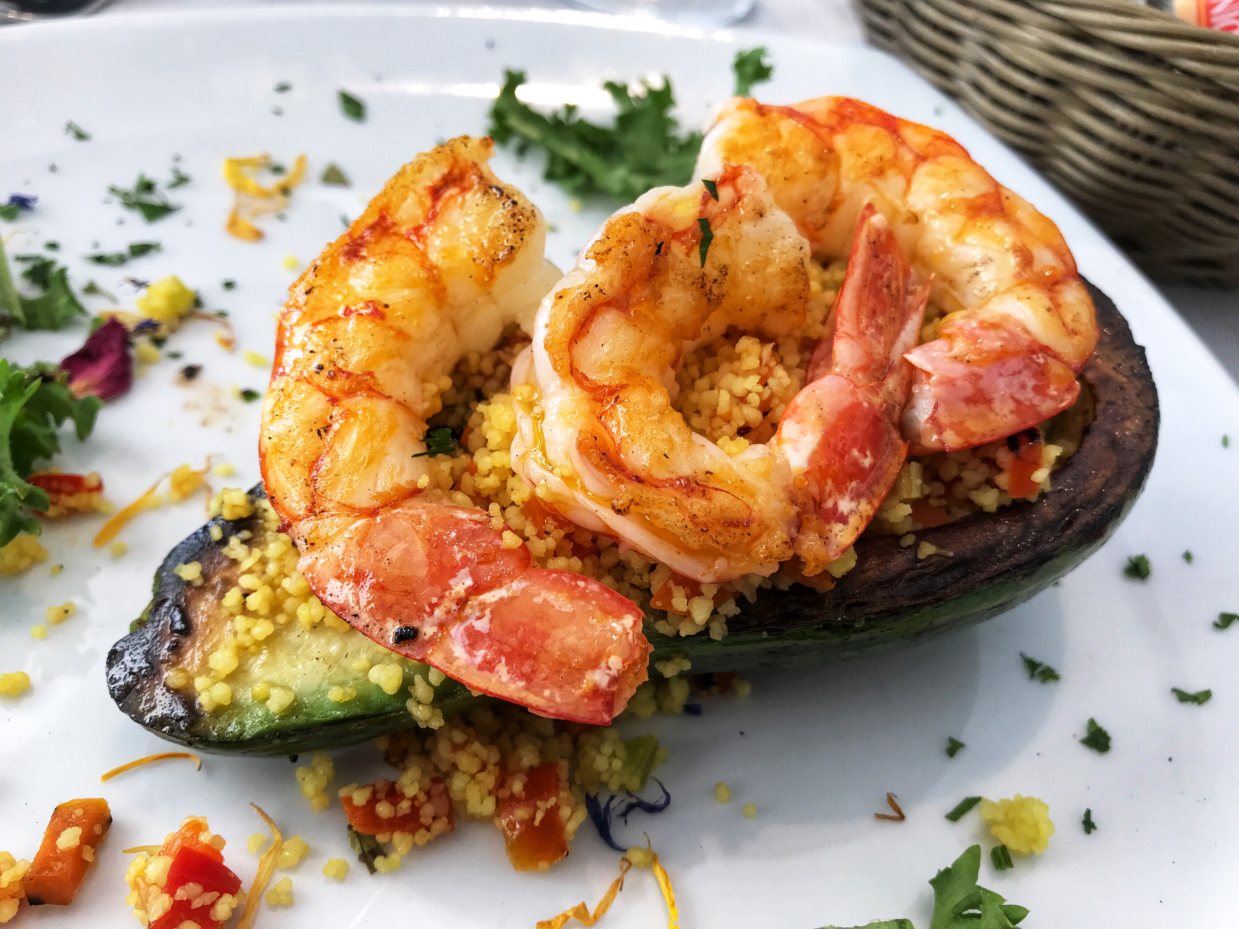 Warm avocado with cous cous and shrimps