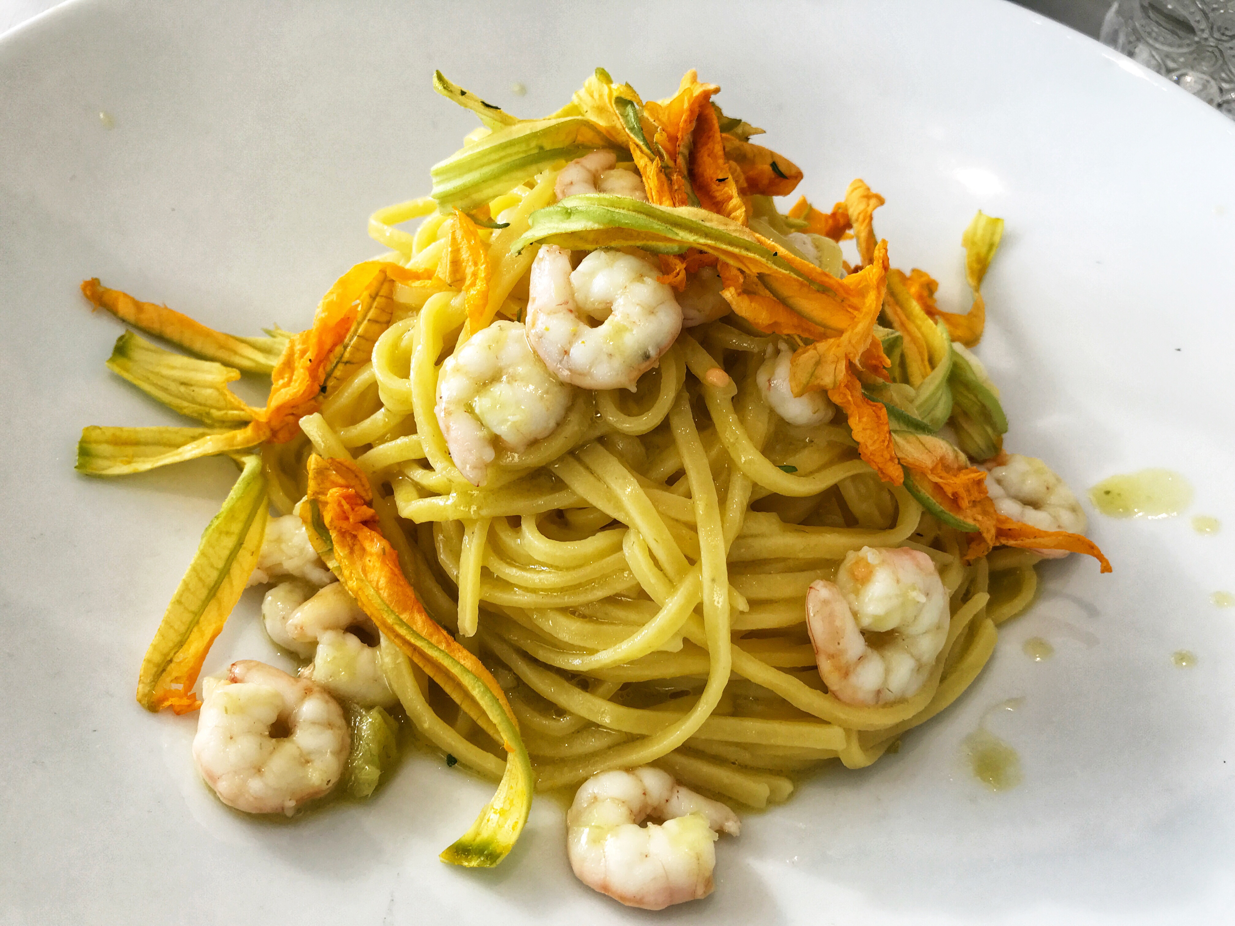 Pasta with courgette flower and shrimps
