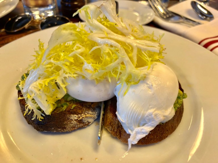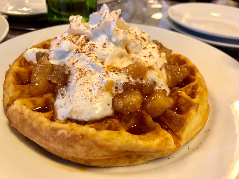 Enjoy a delicious Avocado toast with poached eggs and an amazing waffle with cinnamon apple and cream…