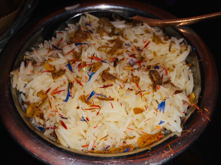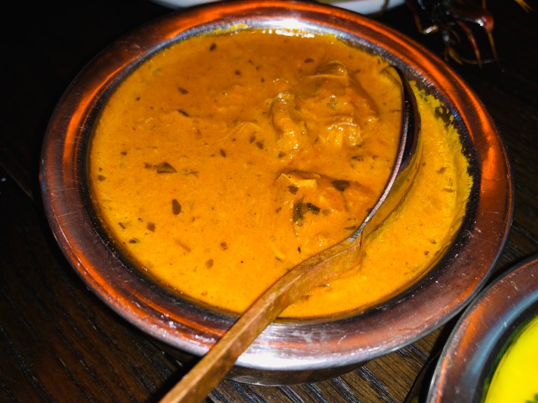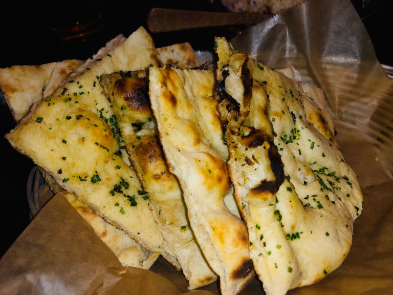 As main course we ordered classic naan, chicken curry, coconut shrimp curry and white rise…