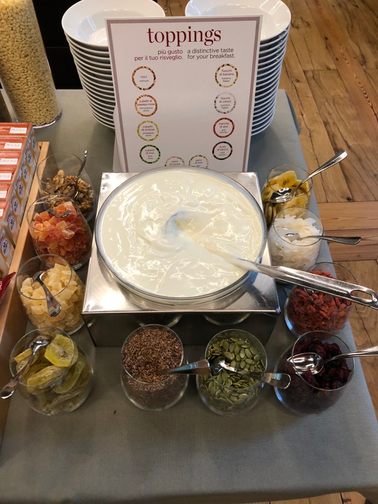 NH Collection Piazza Carlina Hotel in Turin offers an amazing solution for breakfast… fresh white yogurt and a variety of toppings available for guest to enjoy based on personal taste.