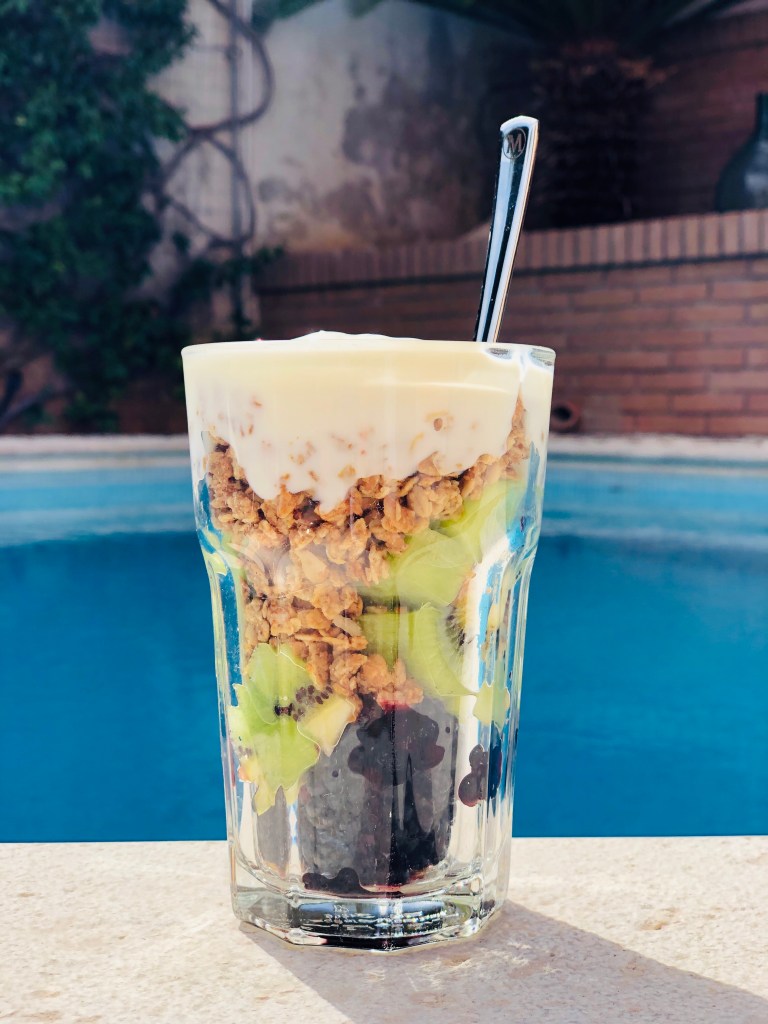 Here is my breakfast: Blackberries, kiwi, muesli and low fat yogurt.