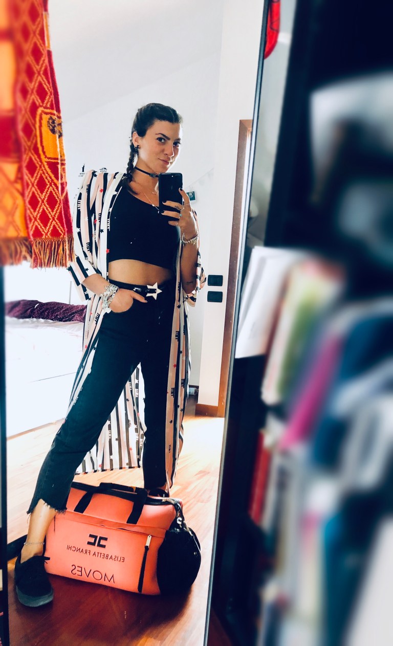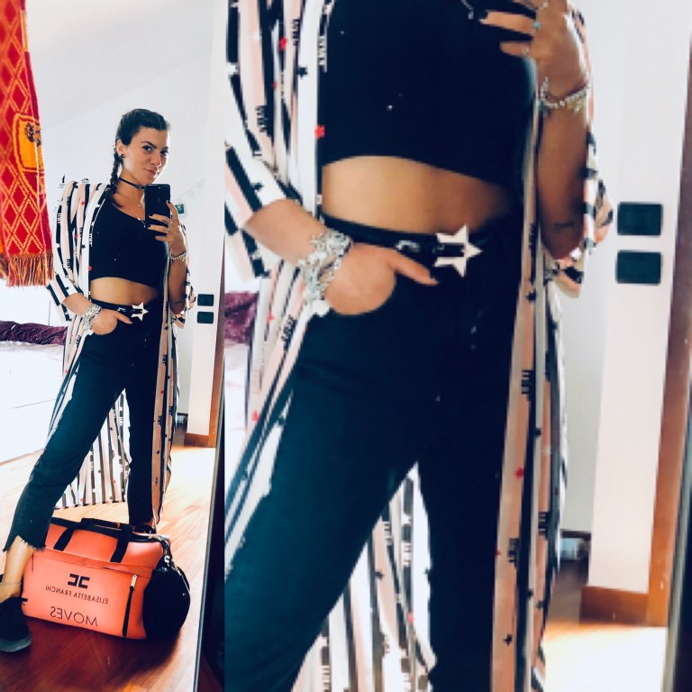 Top and pants by Urban Outfitters, belt, blouse, earrings and bag by Elisabetta Franchi, choker by Dior, shoes by Vans.